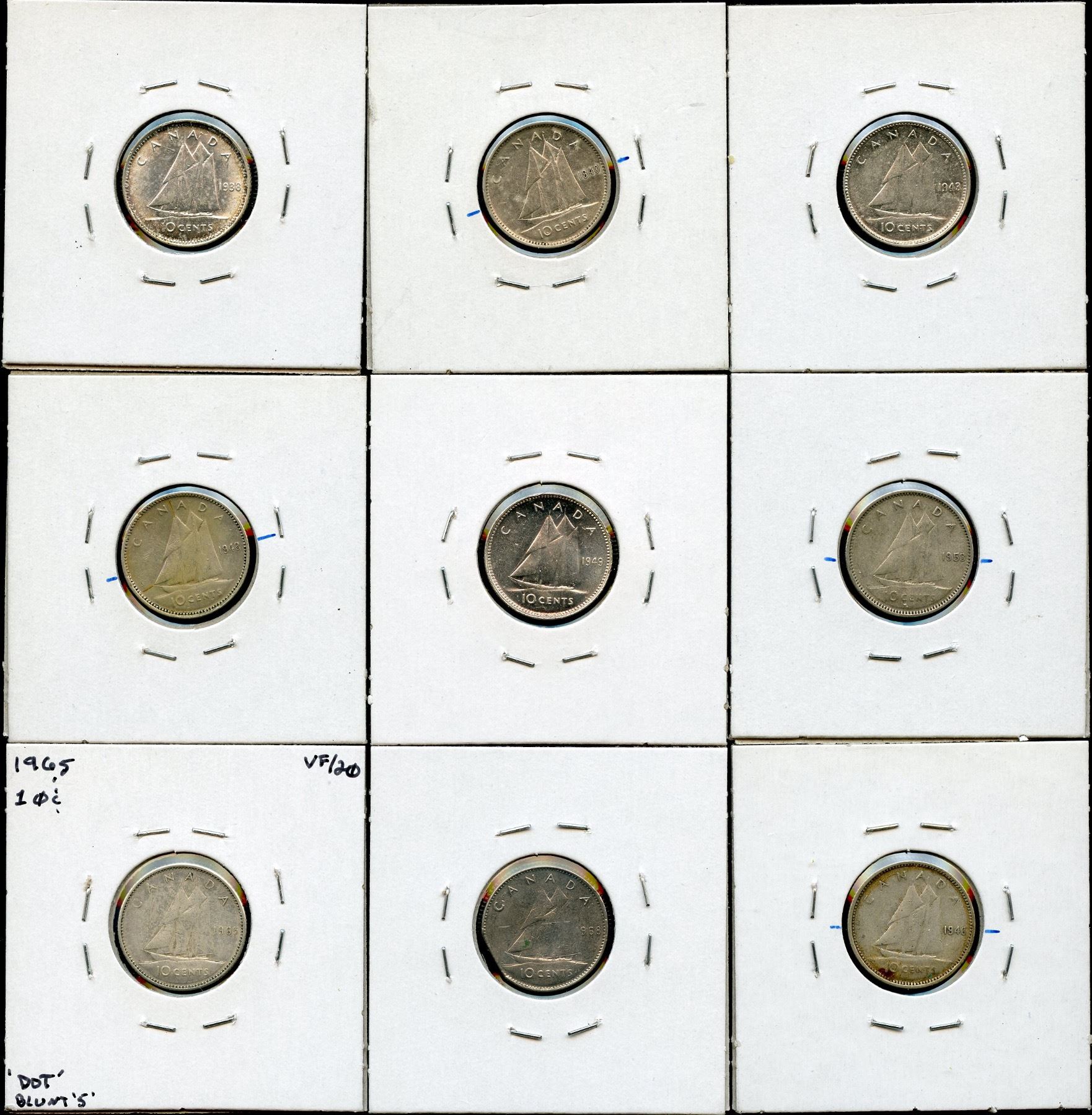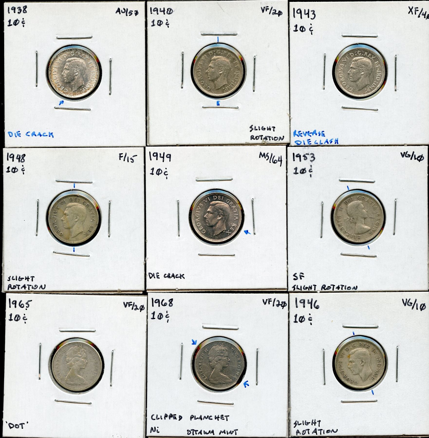 Includes: 1938 AU, die crack. 1940 VF, slight rotation. 1943 EF, rev. die crack. 1946 VG, slight rotation. 1948 Fine, slight rotation. 1949 mint state, die crack. 1953 VG, SF, slight rotation. 1965 VF, blunt 5, dot. 1968 VF, nickel, minor clip planchet. 9 Pcs.