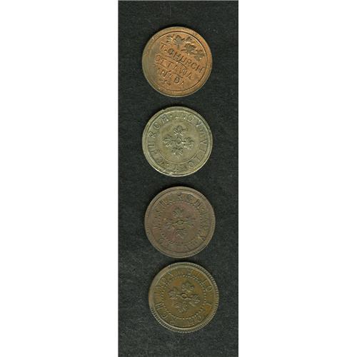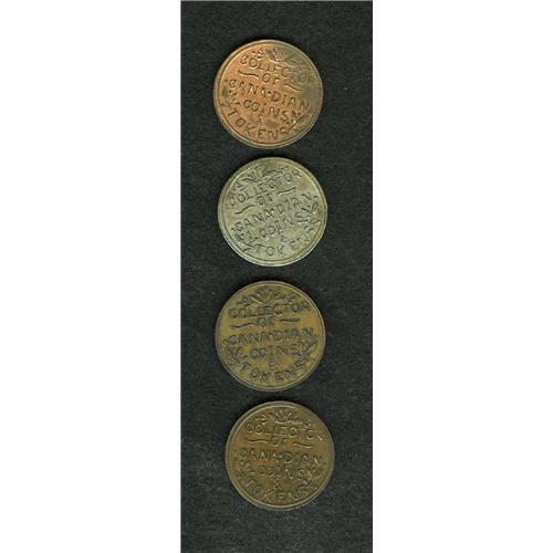 <B>Canada Thomas Church Group Lot.</B></I> Includes Bowman 7-24, brass, 5.6 gms, 24mm, milled edge; B7-24, copper, 7.8 gms, 24mm, milled edge; B7-24, 8.0 gms, 24mm, plain edge; and a B-24, white metal, 8.0 gms, 24mm, plain edge. Current market value about $250-$350.
