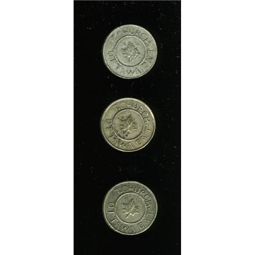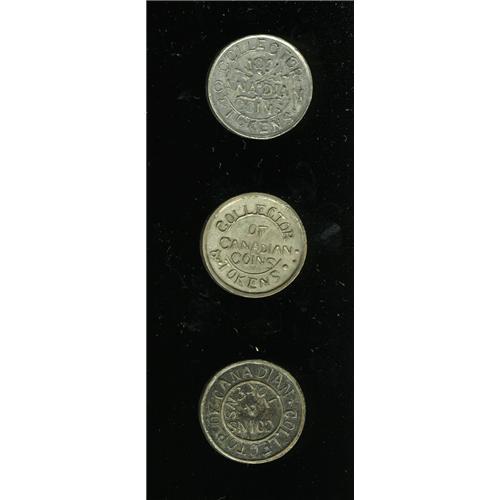 <B>Canada Thomas Church Group Lot.</B></I> Consists of Bowman 1-26, white metal with low crossbars, 8.4 gms, 23mm; B-31, white metal, 23mm; and B-32, white metal, 23mm. Current market value about $150-$250.