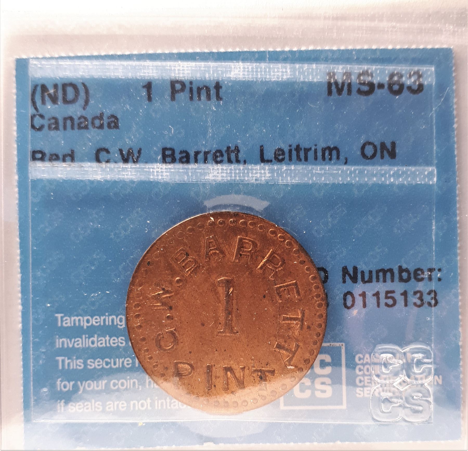 Canada Token 1 Pint ND (1898), C.W. Barrett, Leitrim Ont. MS-63 Red, Certified CCCS (RR)