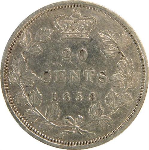 Canada Twenty Cents 1858 VF Scratch. A light golden toned piece with a scratch on Victoria’s hair