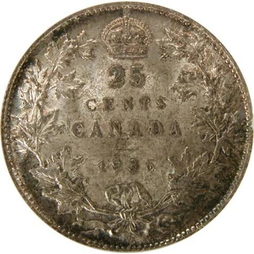 Canada Twenty-Five Cents 1936 NGC MS-65. This is a fully struck and strongly lustrous piece with light golden tan toning. It is the solo highest graded by NGC
