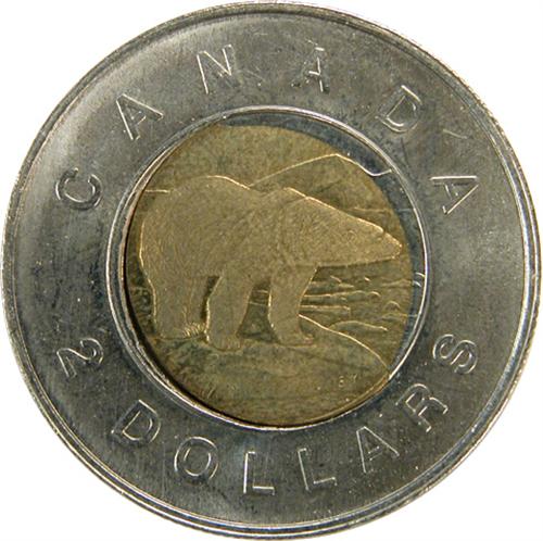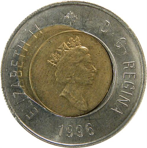 Two Dollars 1996 Off Centre Core. About 15% toward 10 o’clock, with the overlap half way across the legend, Uncirculated