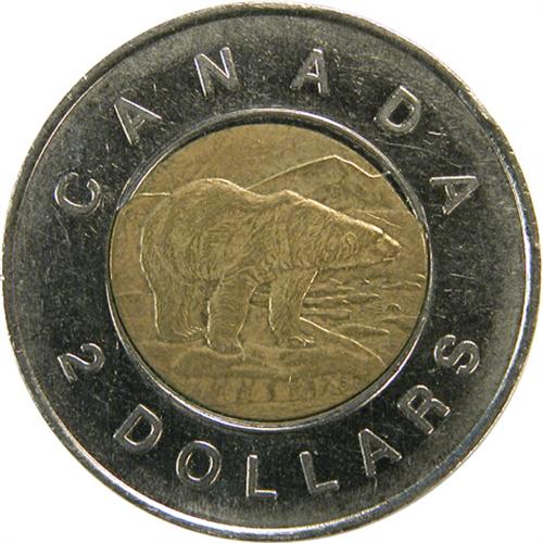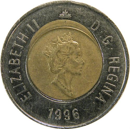 Two Dollars 1996 Off Centre Core. About 10% toward 12 o’clock, with the overlap into the body of the Maple Leaf, EF-AU