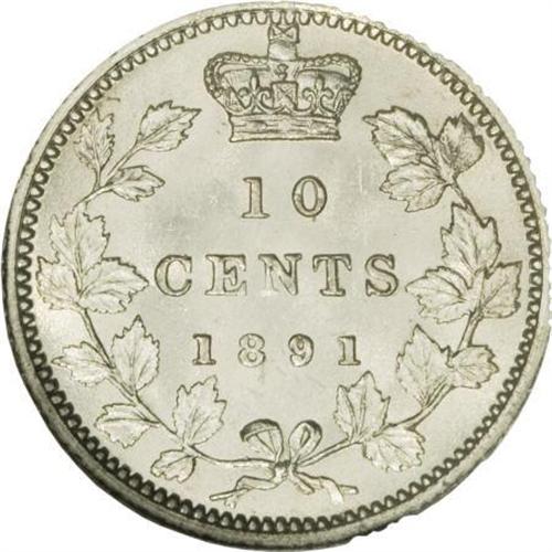 <B>Victoria 10 Cents 1891 Small Date 21 Leaves,</B></I> KM3, MS64 NGC, full white mint brilliance with some tiny surface marks, primarily on the obverse. Rare in this quality.<BR><BR><b>Shipping:</b> Coins & Currency (<a target="_blank" href="http://www.heritageauctions.com/common/shipping.php">view shipping information</a>)