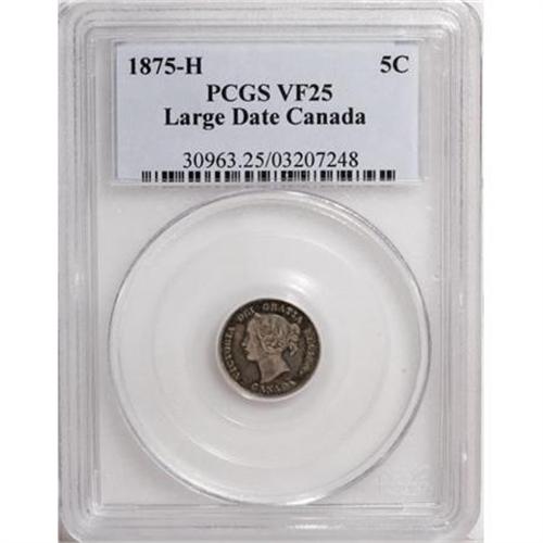 <B>Victoria 5 Cents 1875H,</B></I> KM2, VF25 PCGS Large Date, nicely toned with some superficial patination on the reverse wreath. Scarce variety.<BR><BR><b>Shipping:</b> Coins & Currency (<a target="_blank" href="http://www.heritageauctions.com/common/shipping.php">view shipping information</a>)