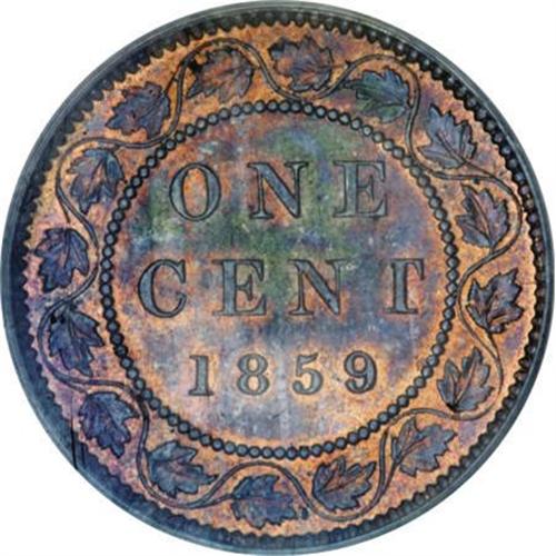 <B>Victoria Cent 1859/8 Wide 9,</B></I> KM1, MS63RB PCGS, silky surfaces with a perfect blend of original luster and toned centers. Very scarce and desirable in this quality.<BR><BR><b>Shipping:</b> Coins & Currency (<a target="_blank" href="http://www.heritageauctions.com/common/shipping.php">view shipping information</a>)