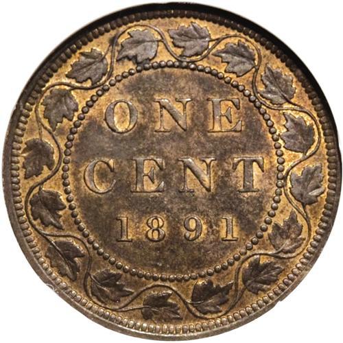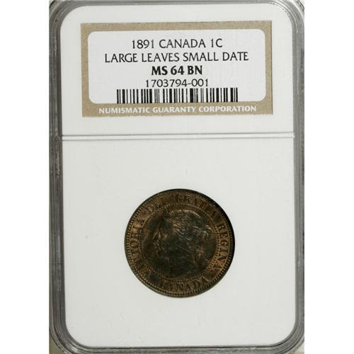 <B>Victoria Cent 1891 Small Date Large Leaves, </B></I>KM1, MS64 Brown NGC, a lovely example of this key date with considerable mint luster on both sides. Rare and desirable in this superior quality.<BR><BR><b>Shipping:</b> Coins & Currency (<a target="_blank" href="http://www.heritageauctions.com/common/shipping.php">view shipping information</a>)
