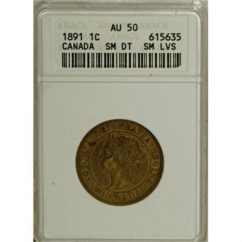 <B>Victoria Cent 1891 Small Date Small Leaves, </B></I>KM1, AU50 ANACS, deep brown surfaces with traces of original luster in the legends, very scarce grade for this variety.<BR><BR><b>Shipping:</b> Coins & Currency (<a target="_blank" href="http://www.heritageauctions.com/common/shipping.php">view shipping information</a>)