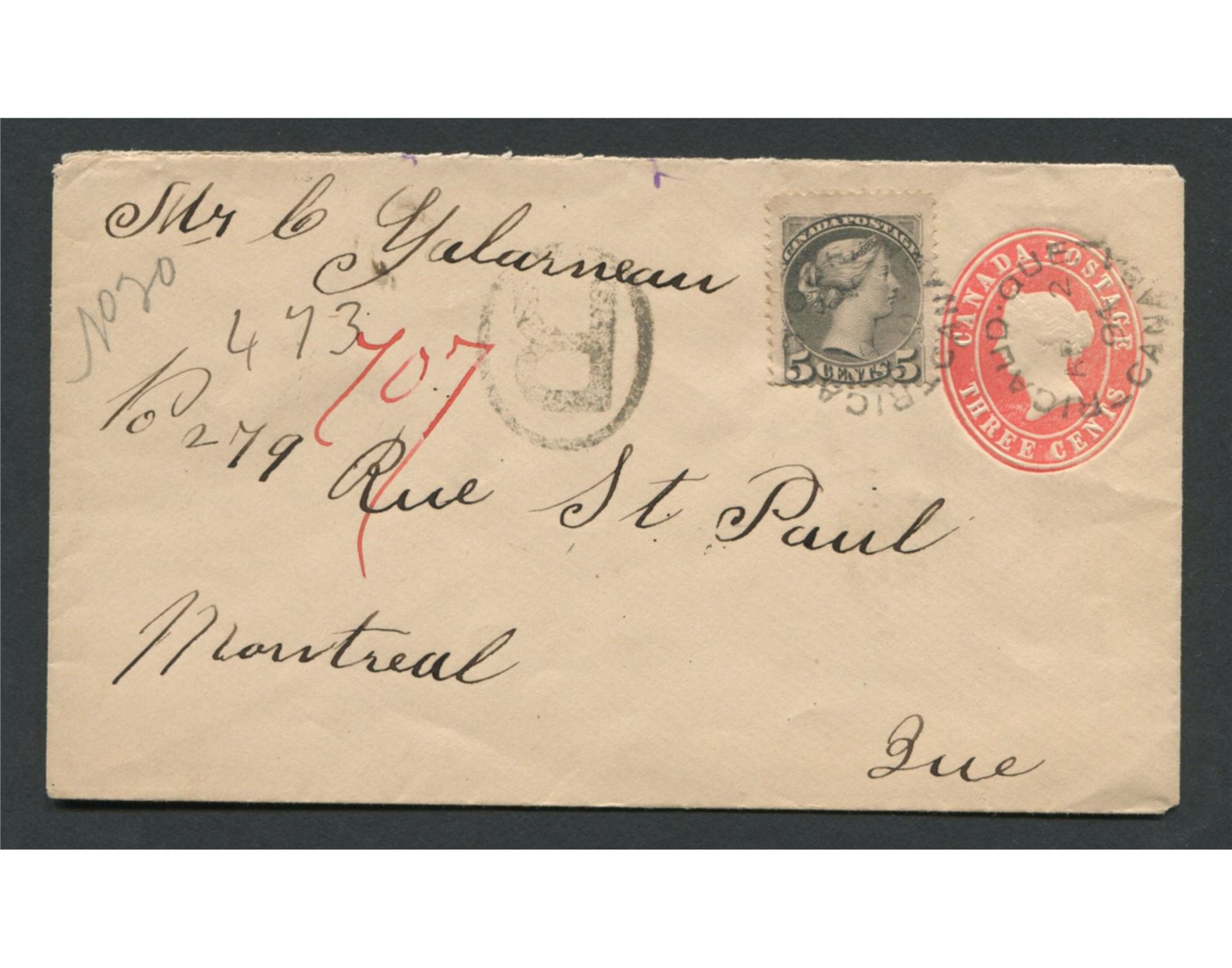 Canada Victoria stamp cover. Stamp is a 5 cent Victoria small queen, with 3 cent Canada Postage. This letter was sent Registered, has a fairly clear Ricaud, Quebec circular cancel, cancelled 1894. Has a clear Montreal address.