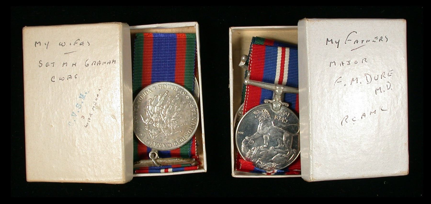 Two pairs of Canadian WWII service medals, each consisting of a 1939-45 Medal and Canadian Volunteer Service Medal (each with mounting bar for both), housed in two separate boxes, the first with hand-written notation "M H GRAHAM, CWAC", and the second: "Major F.M. Dure M.D., RCAMC"; the relationship between the two not being entirely clear, although of the same family, we are told (Lot of 4 Silver service medals)
