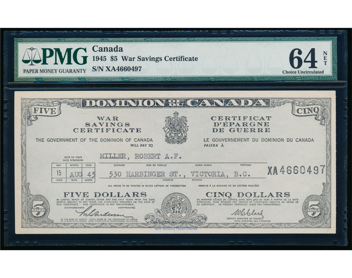 Canada War Savings Certificate. $5.00. 1945. No.XA4660497. PMG graded Very Choice Uncirculated-64 NET. (Note: Minor Rust).