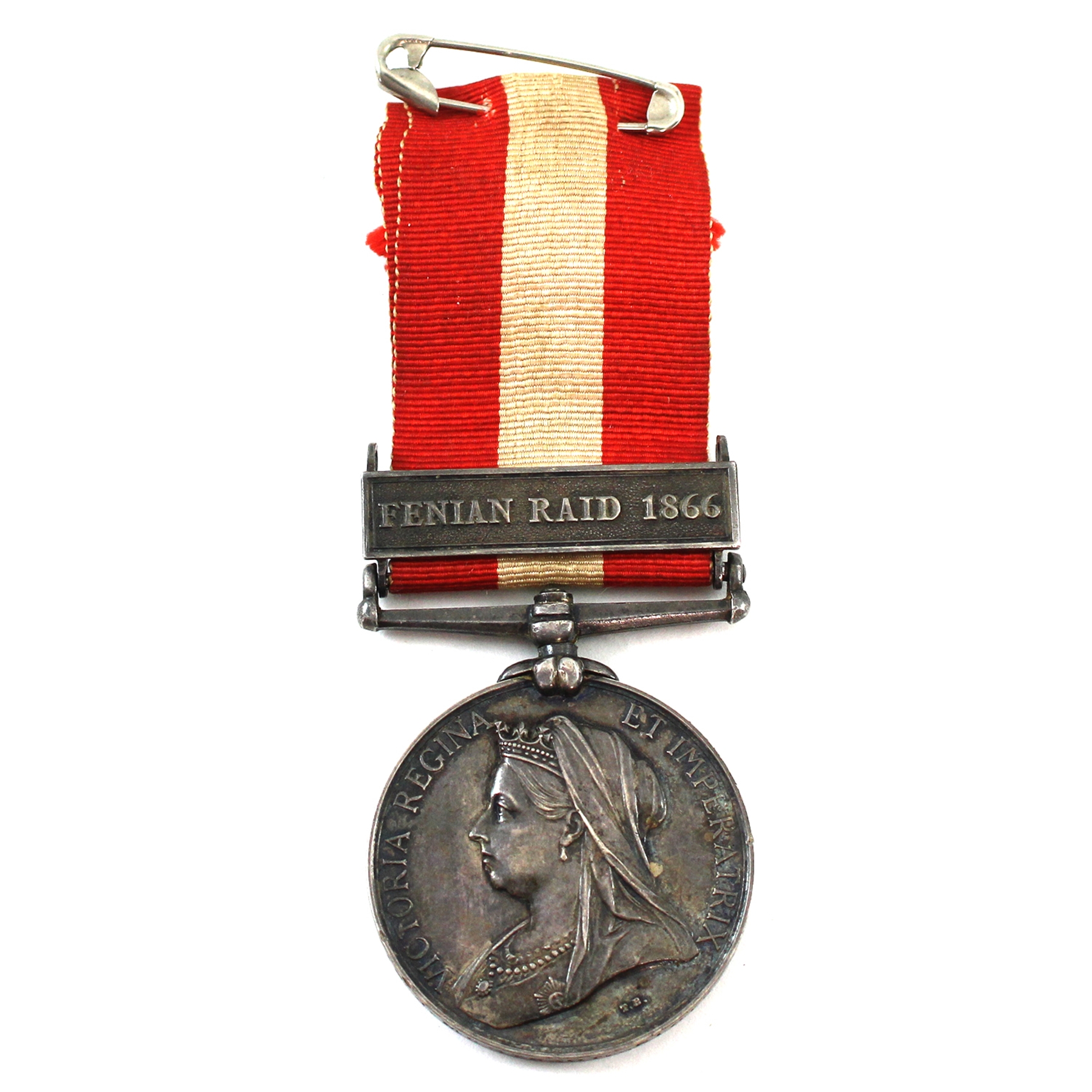 NAMED: Pte John McGregor Elora Rifle Company. Accompanied by copies of McGregor's Application for Grant under the Fenian Raid Volunteer Bounty Act (dated 1912). Deep, even patina and sharp detail, light handling wear to be expected. Safety pin in ribbon.