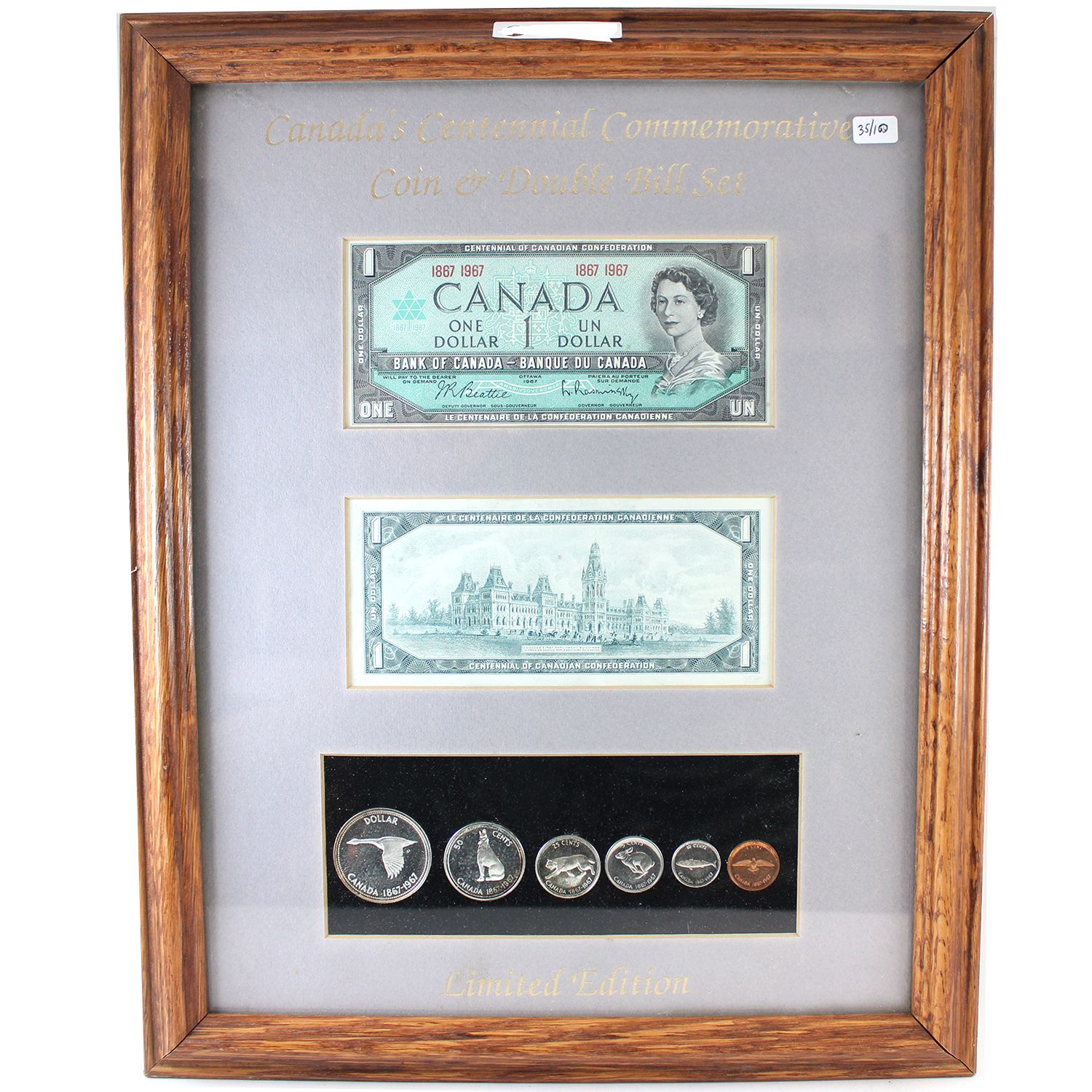 Canada's Centennial Commemorative Coin & Double Bill Set in Wooden Frame. Features an example of front and back of 1967 no serial number note and a full 6-coin 1967 year set. Taped in at the back of frame