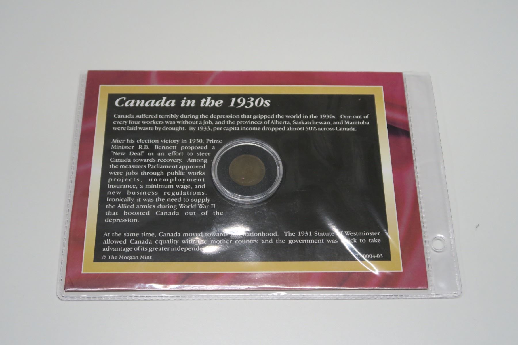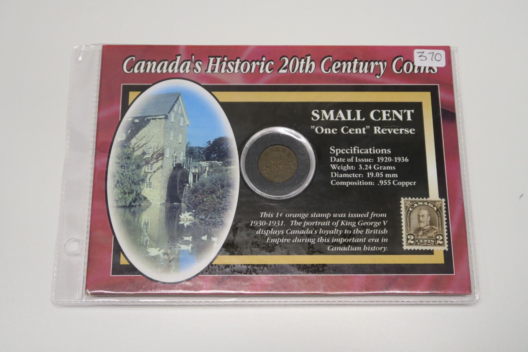 Canada’s Historic 20th Century Coins: Small Cent “One Cent” Reverse. 1931 Cent along with early George V 2 Cent Stamp. Housed in a Morgan Mint folder.