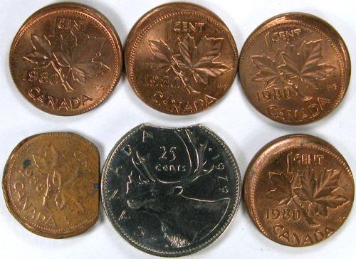 Canada One Cent 1980, four pieces Struck Off-Centre 8% to 10%, all Red and Brown Uncirculated. Plus 1988 Cent with a 10% Straight Clip, EF with carbon spots and 25 Cents 1979 with a small Circular Clip, AU