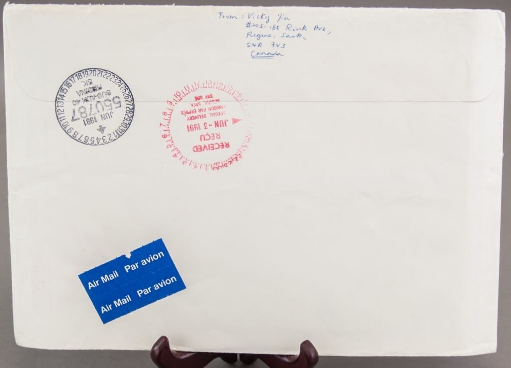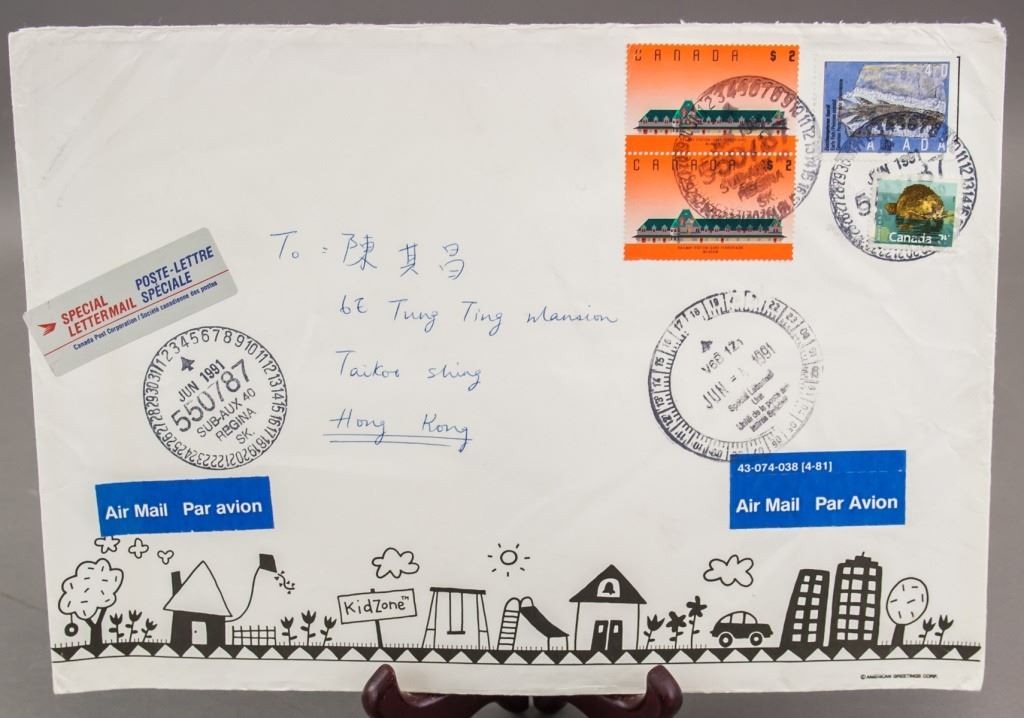 Envelope with stamps. Addressed to Hong Kong from Canada. With four Canadian stamps and four postmarks. 19 x 28 cm.