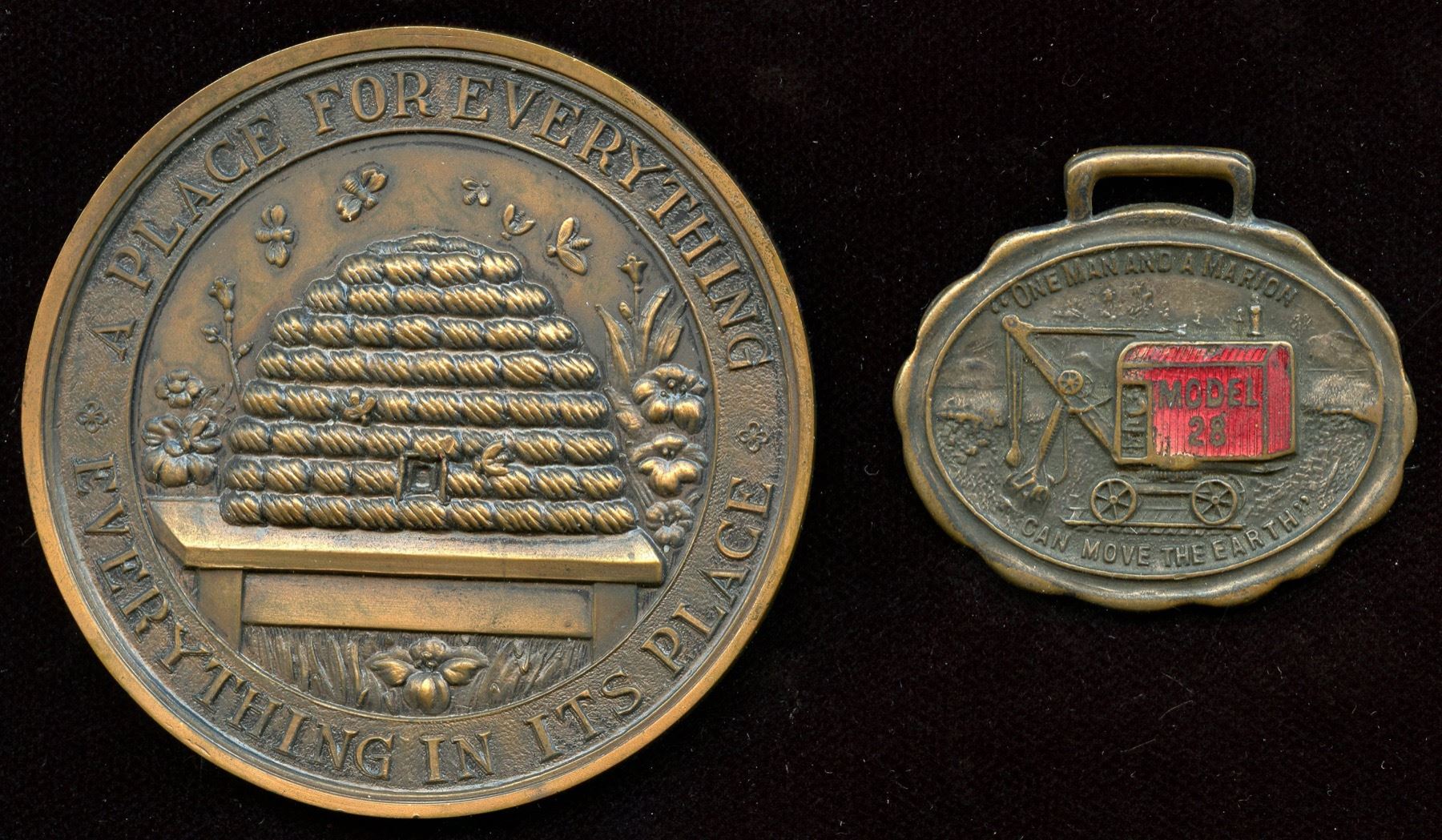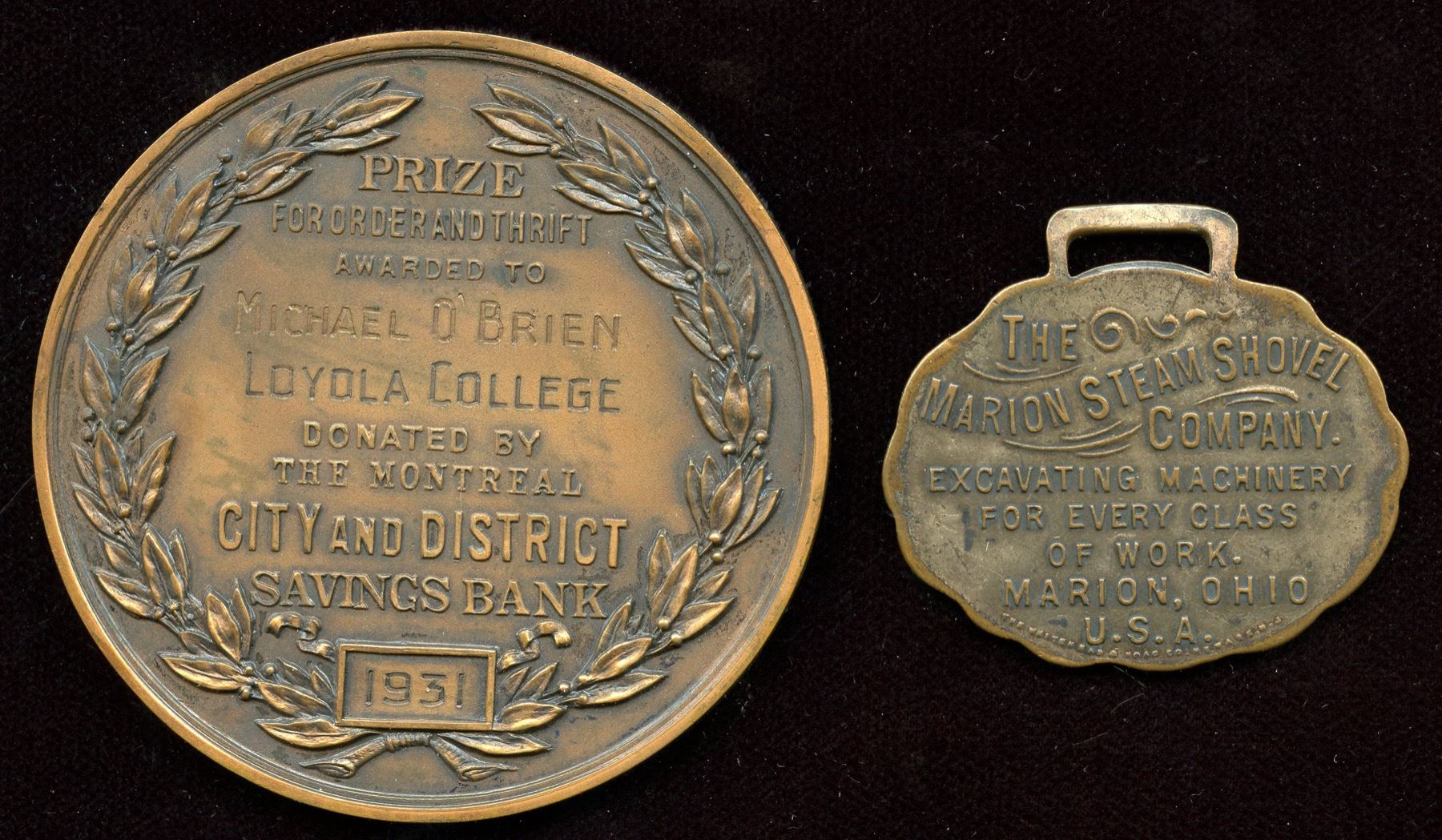 City and District Savings Bank, to: Michael O'Brien/ Loyola College, 1931 in case of issue, bronze; a watch fob for the Marion Steam Shovel Company, Marion, Ohio. 2 Pcs.