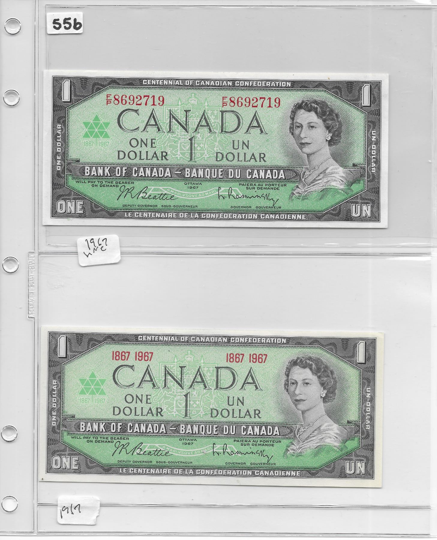Canadian 1 dollar bill (x2) 1867-1967 Beattie/Rasminsky