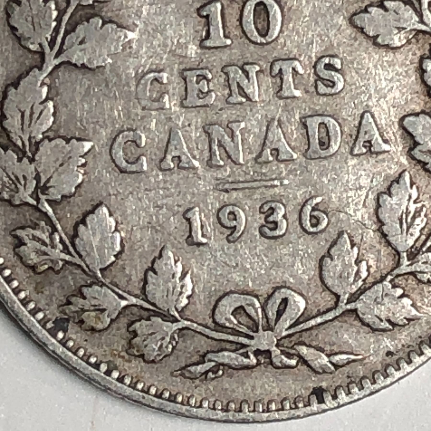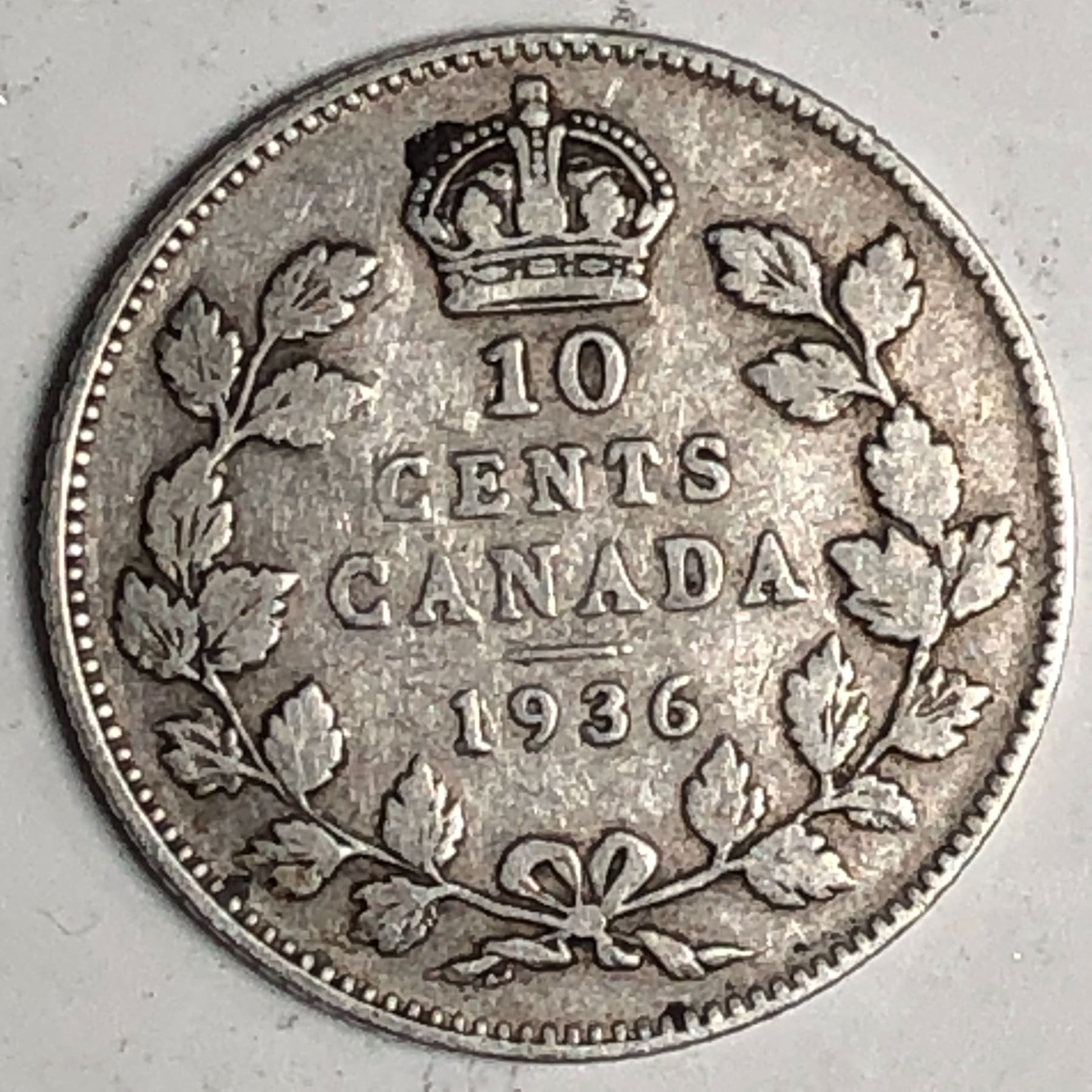 Canadian .10 Cent Dime 1936 Bar F+