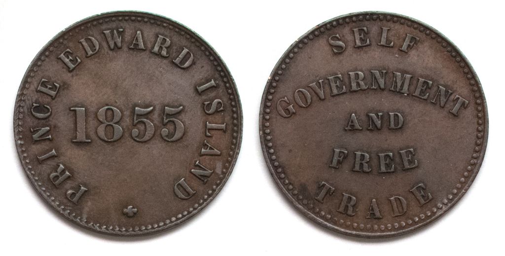 The token says "Self Government and Free Trade." The reverse says "Prince Edward Island, 1855." Before its Confederation in 1867, the nation of Canada was a loose collection of individual European colonies. Apparently, a decade before the Confederation, residents of Prince Edward Island pushed for independent national status. This token was part of that campaign. In 1873 Prince Edward Island joined the confederation.City: County: State: Prince Edward Island