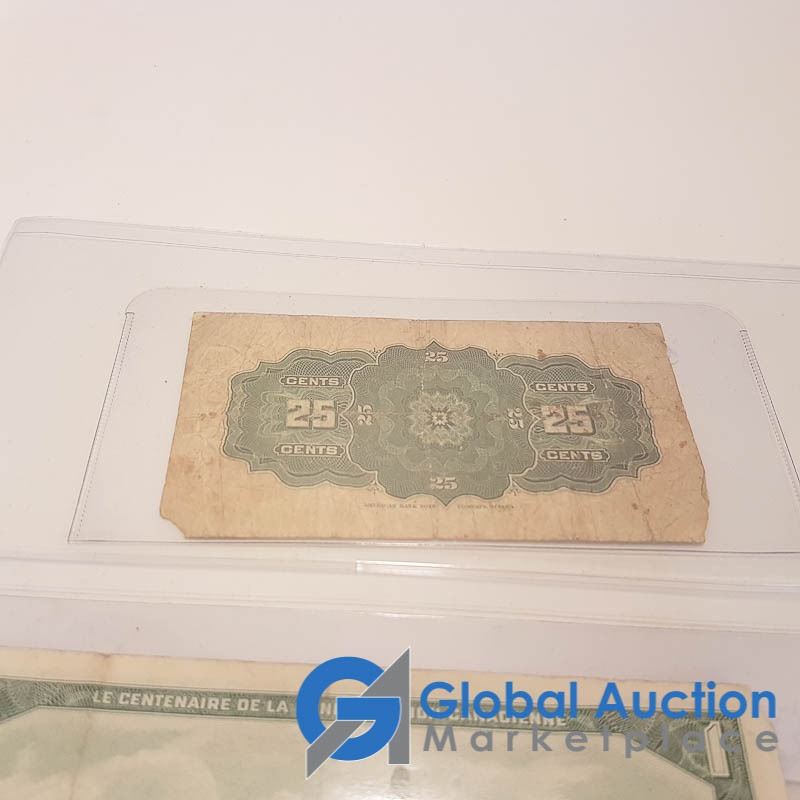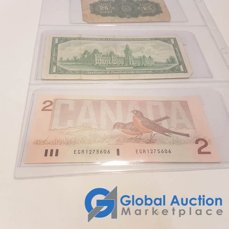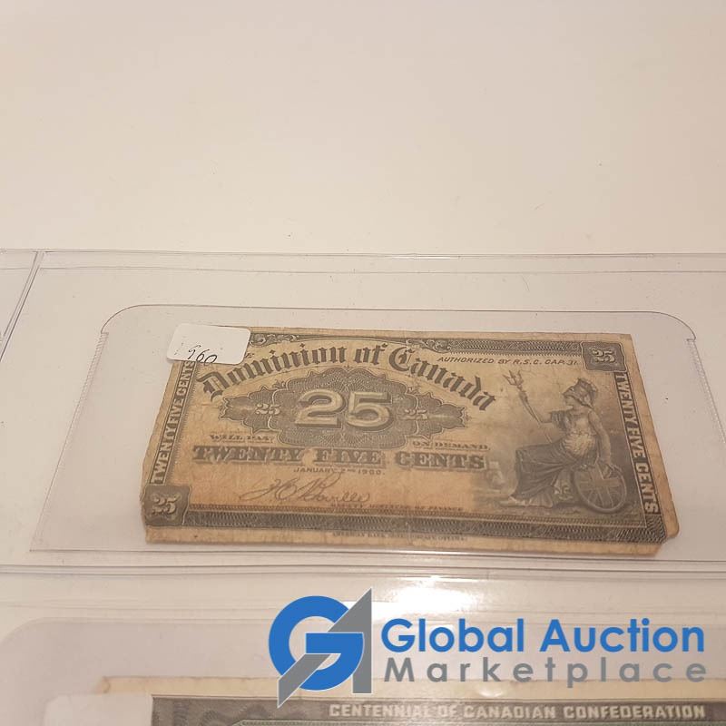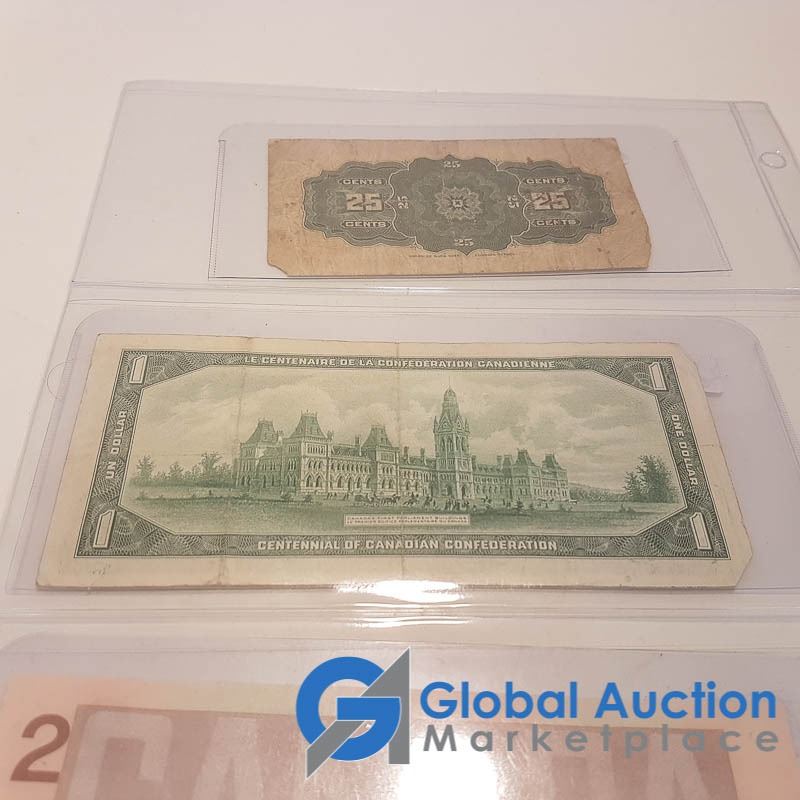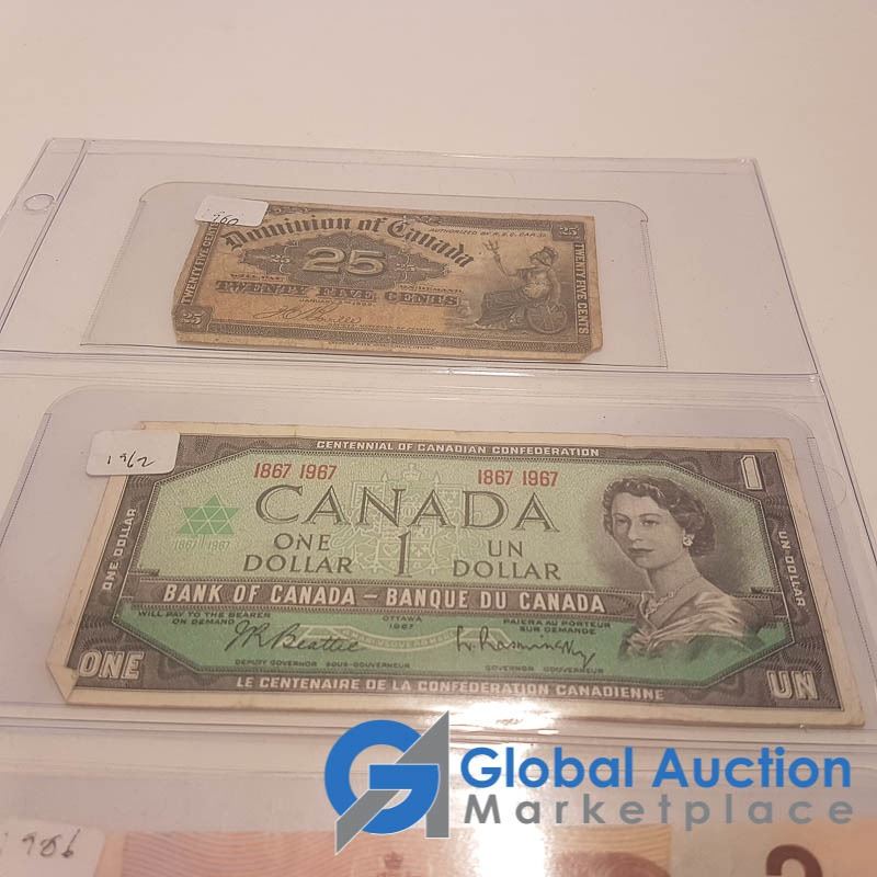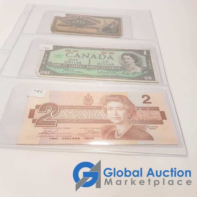 Canadian 1900 Twenty Five Cent Bill, 1967 One Dollar Bill and 1986 Two Dollar Bill