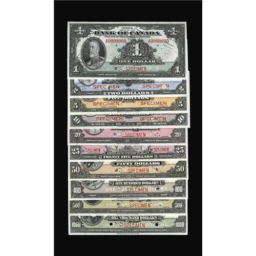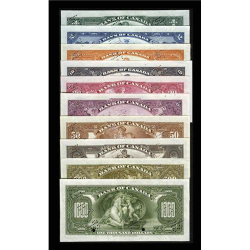 <B>Canadian 1935 English Specimen Note Complete Set including</B></I> BC-1S $1; BC-3S $2; BC-5S $5; BC-7S $10; BC-9S $20; BC-11S $25; BC-13S $50; BC-15S $100; BC-17S $500; and BC-19S $1000. Each note has an all zeros serial number. The notes have been roulette cancelled three times each with "SPECIMEN." Also, the notes have "SPECIMEN" printed once or twice in red ink on the face. The notes have also been punch cancelled twice except for the $5 and $10. The back right-hand margin of the $2 and $5 each display fiber tape. Adhesive residue is also seen in the back right-hand margin of the $10. This is how these notes were sold by the Bank of Canada in their November 1999 auction. Only seven complete sets of 1935 English specimen notes can be assembled. <B>Choice Crisp Uncirculated.</B></I><BR><I>From The Halton Lake Collection</B></I>