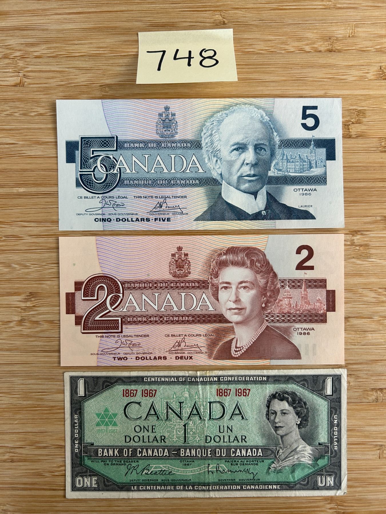 Canadian $5, $2, and $1 bills.
