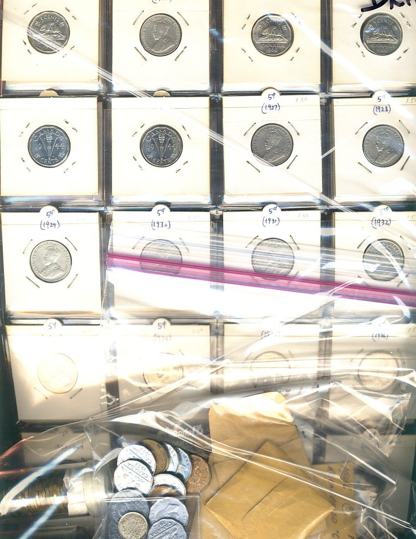 Canadian 5¢ Lot; Includes Early silver 5¢ culls(32), 1923-1960 partial date set excluding the 1925 & 1926 Fr, VG to UNC along with handful of 1942, 1943 & 1952 EF to UNC & 1942 5¢ Tombac partial UNC roll. Includes 26 pcs some stained but basically all AU+ to UNC+.