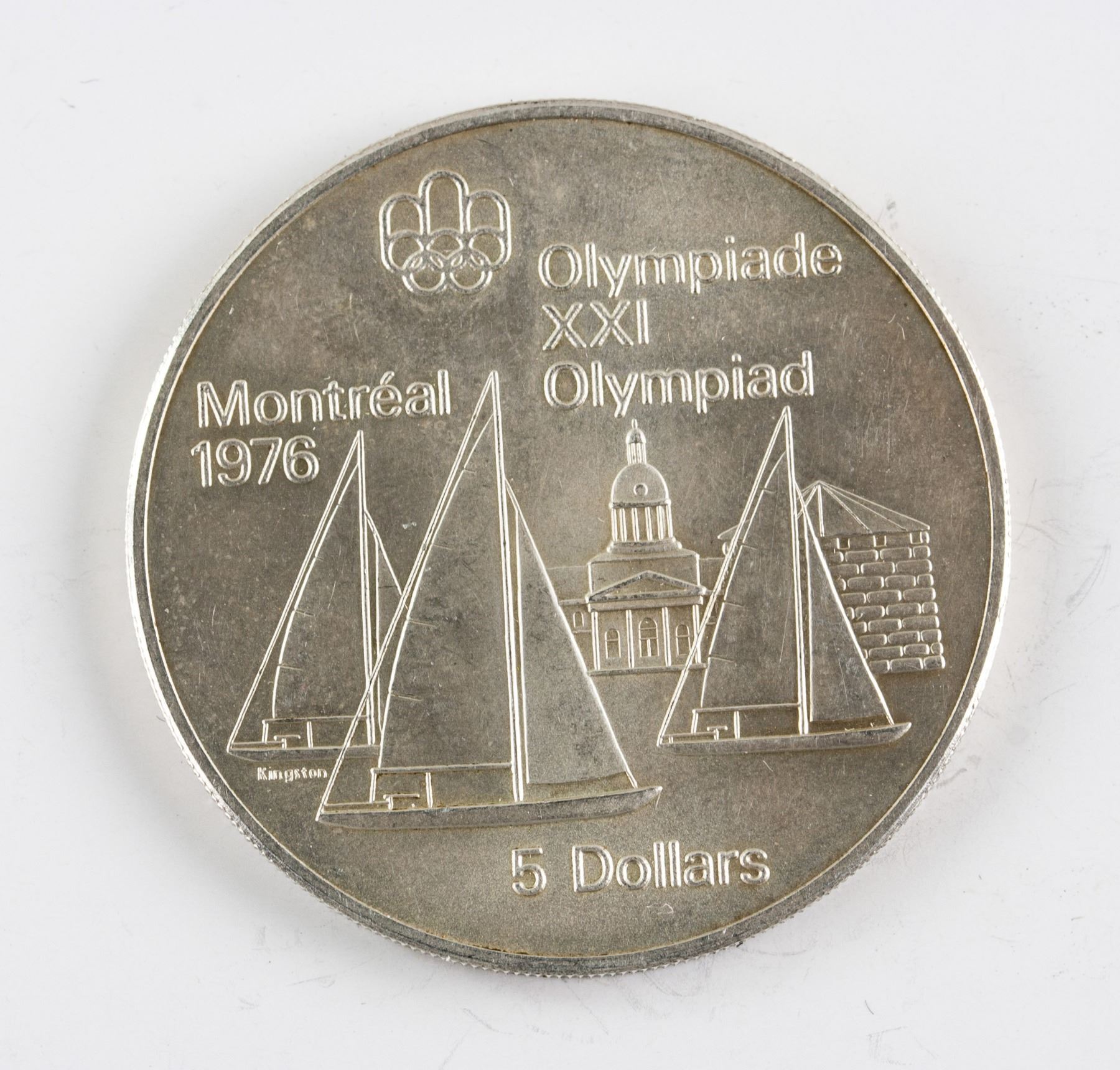 1973 Canada non circulating $5 silver (.925) coin; commemorative issue 1976 Montreal Olympics; obverse engraved effigy of Queen Elizabeth II facing right, lettering ELIZABETH II CANADA 1973; reverse engraved sail boats, lettering Olympiade XXI, Montréal Olympiad, 1976, 5 Dollars; reeded edge; 3.8 cm, 24.45 grams