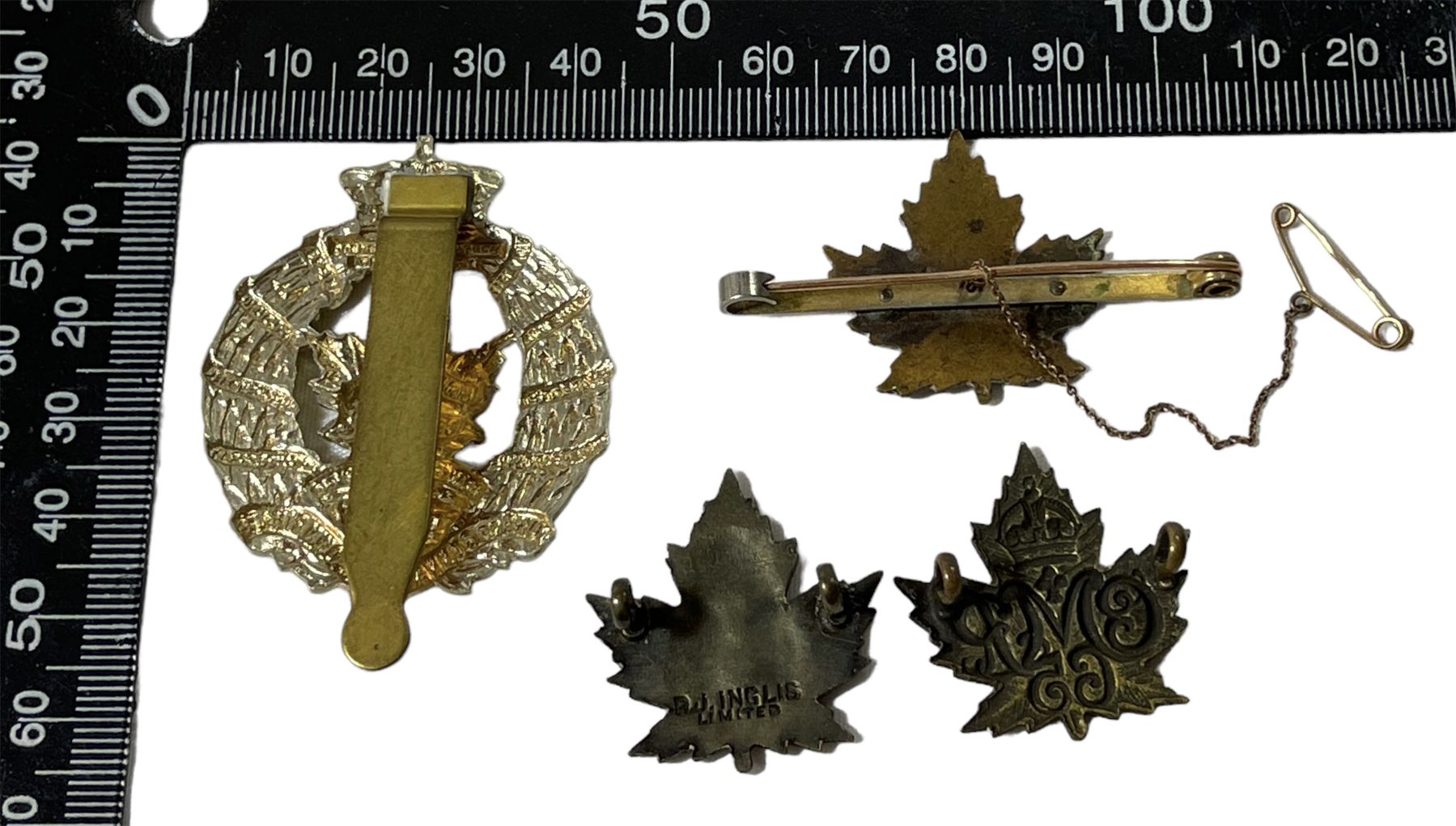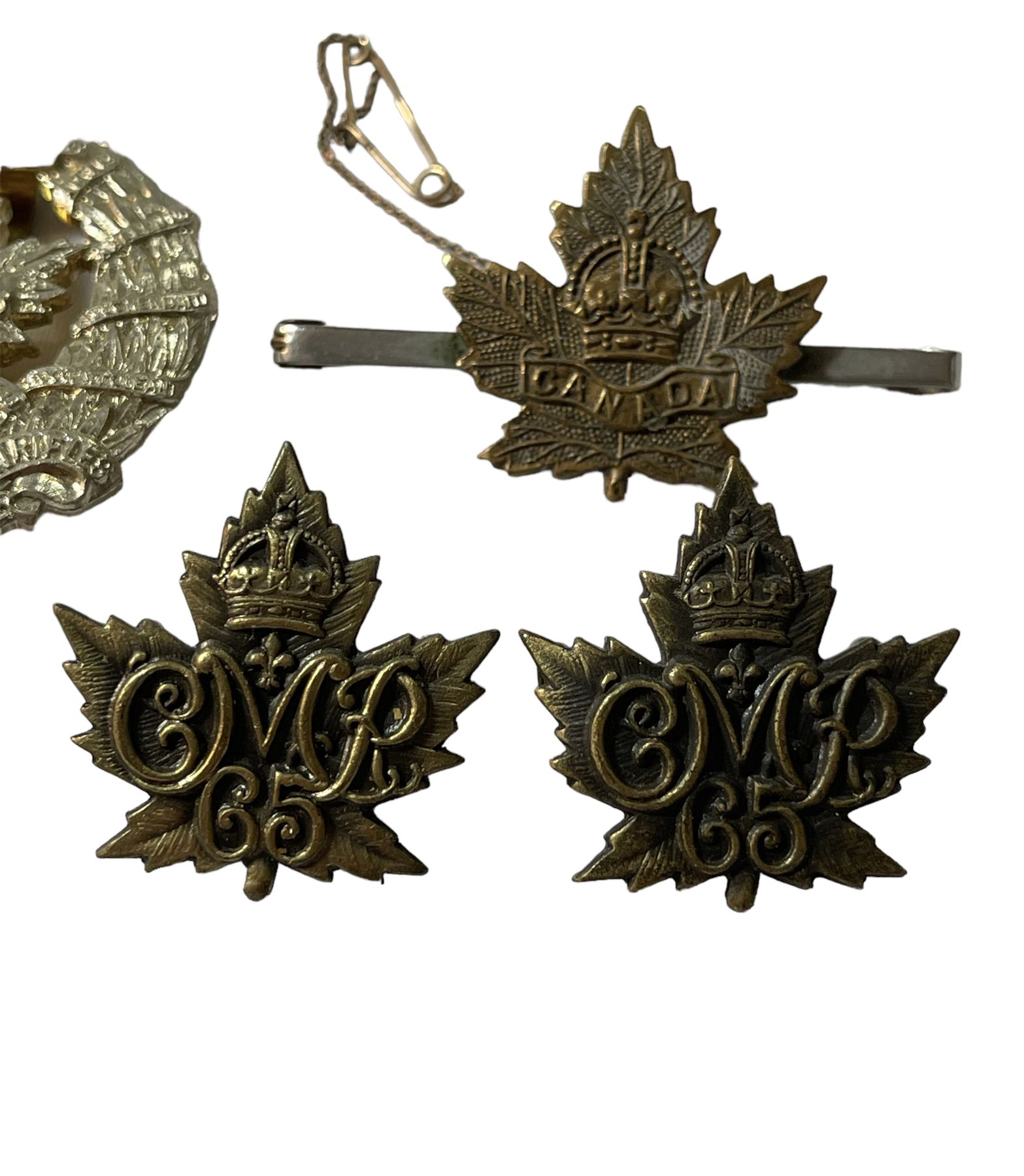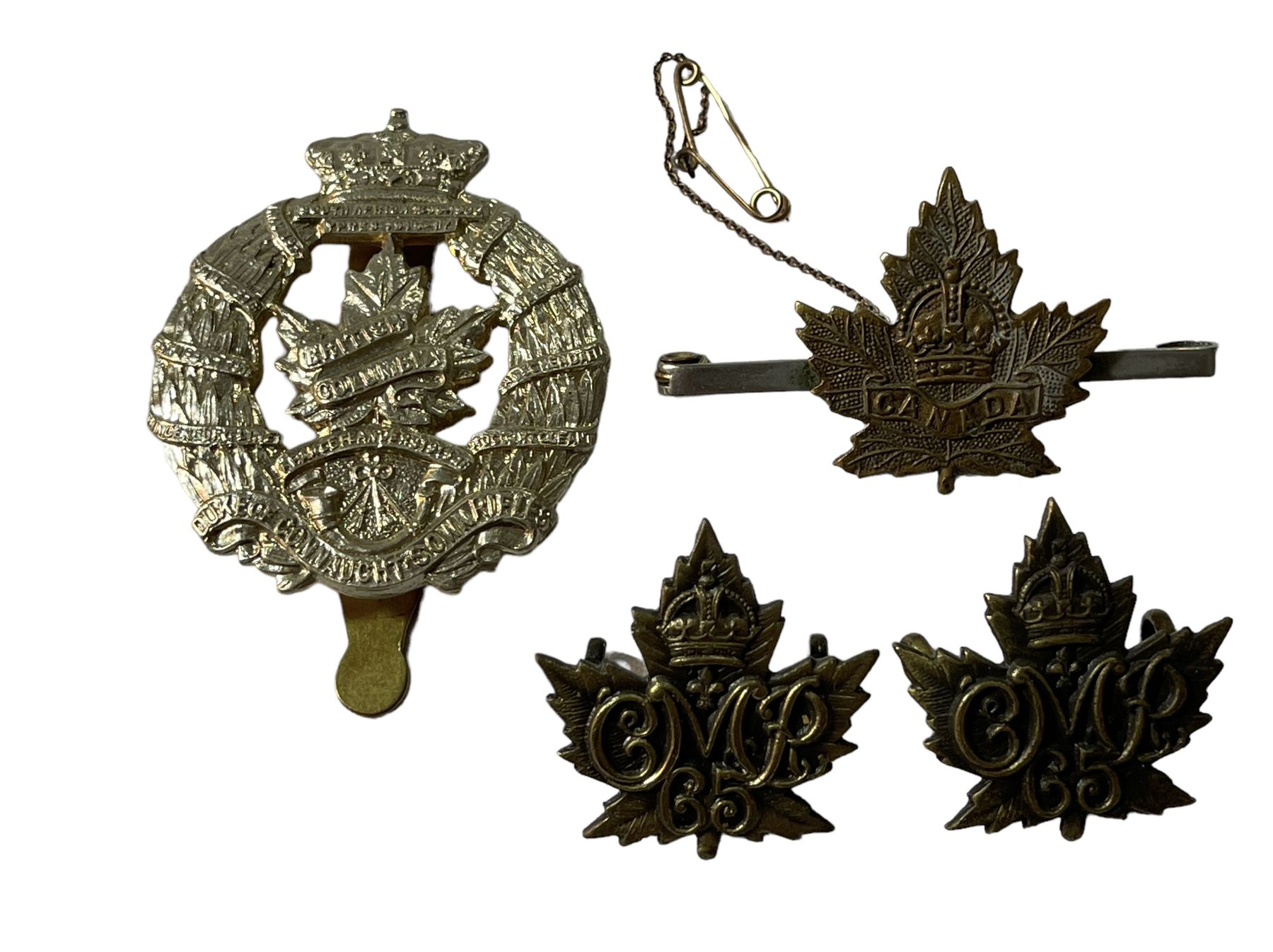 Lot of 4. Collar badge pair 65th Carabiniers, WW1 Sweetheart pin, Duke of Connaught's Cap Badge