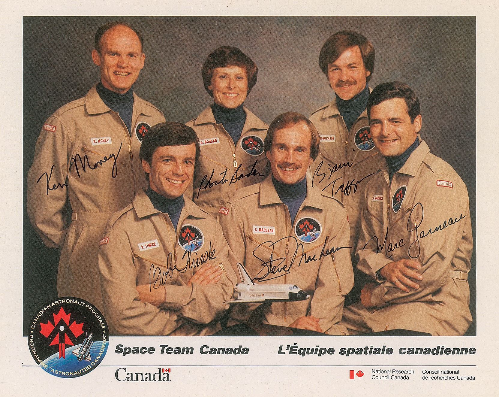Two official color photos of Space Team Canada, 10 x 8 and 9.25 x 8, both showing the 1983 National Research Council six-person crew, with both pictures signed in black ink or felt tip by the pictured member: Ken Money, Robert Thirsk, Roberta Bondar, Bjarni Tryggvason, Marc Garneau, and Steve MacLean. In overall fine condition.