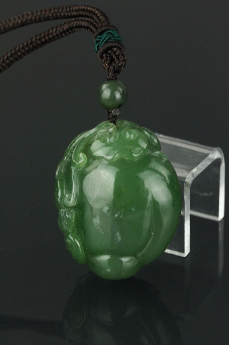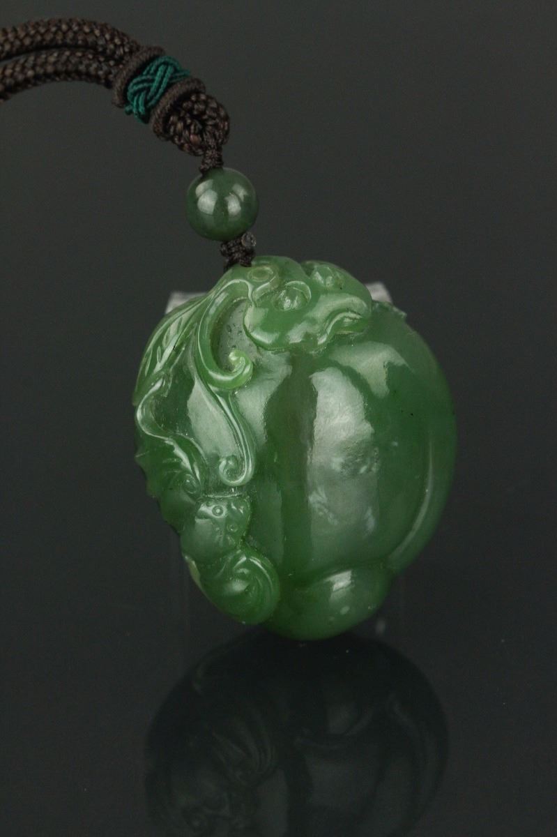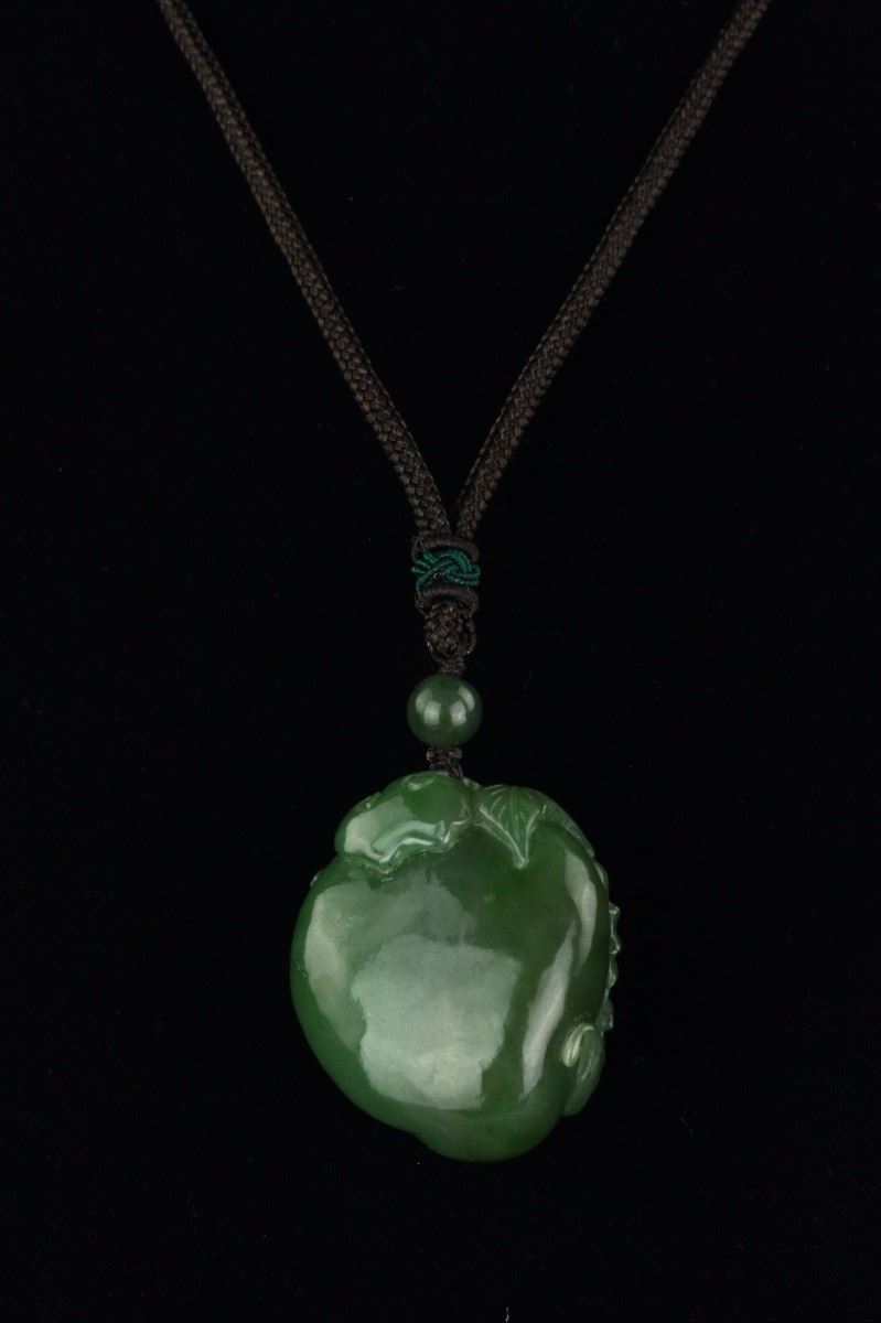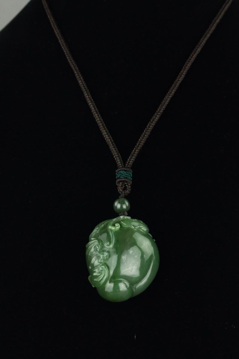 Canadian British Columbia Grade A nephrite pendant necklace; featuring bats perched on peach; of emerald green tone; suspending on brown string; H: 4.5 cm, W: 3.8 cm, 57 grams