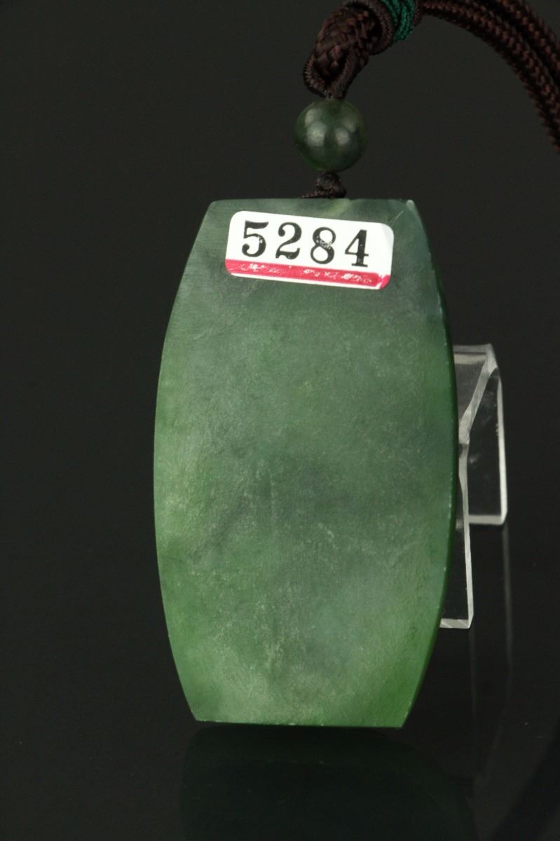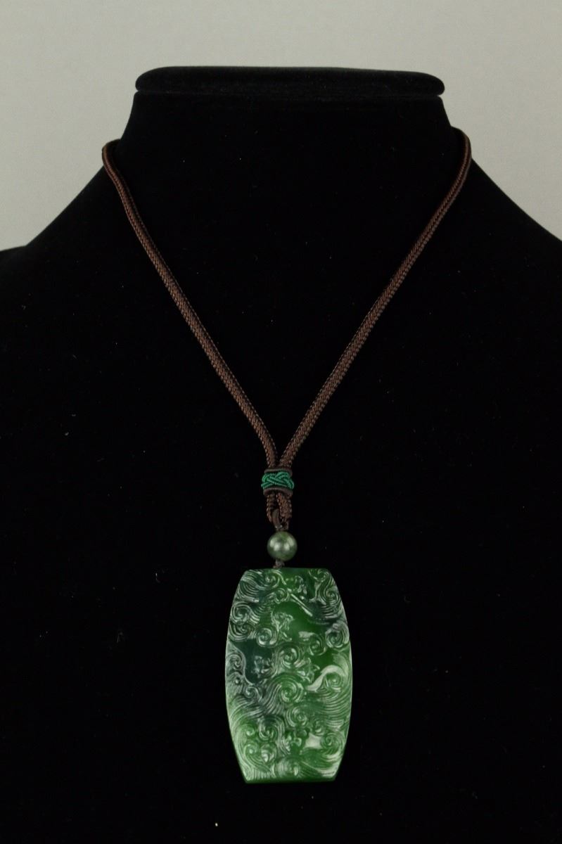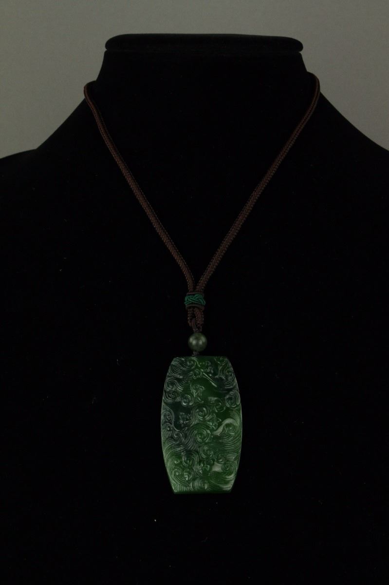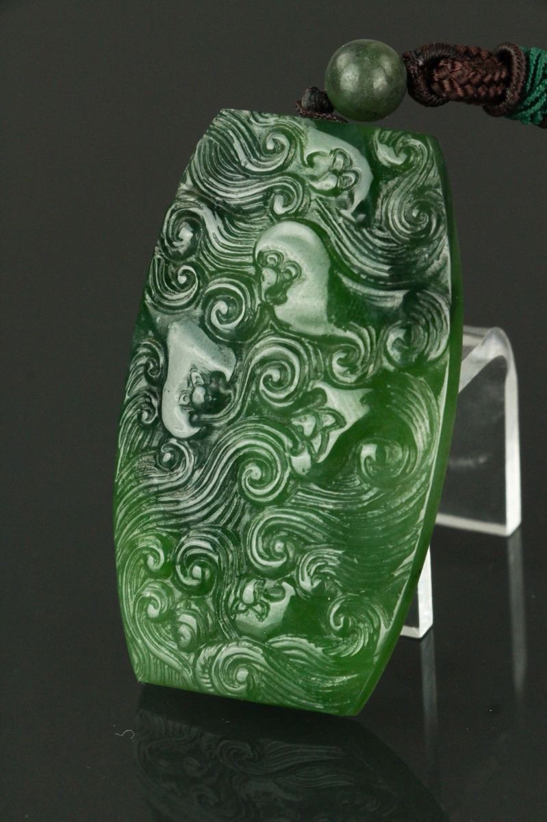 Canadian British Columbia Grade A nephrite pendant necklace; featuring bats amongst waves in low relief; of emerald green tone; suspending on brown string; H: 5.6 cm , W: 3.4 cm, 35 grams