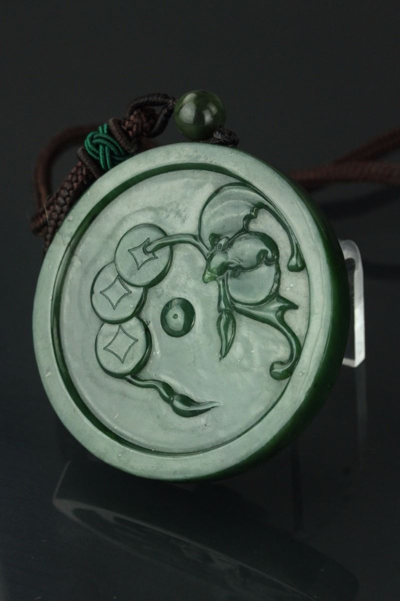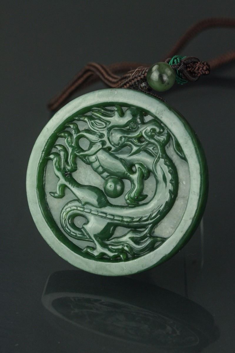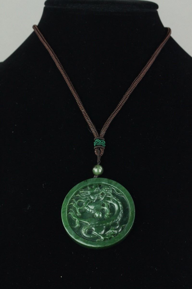 Canadian British Columbia Grade A nephrite pendant necklace; of circular form; featuring coiling dragon and a string of coins in low relief; suspending on brown string; D:5 cm, 38 grams