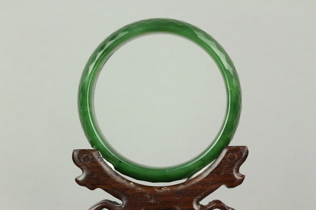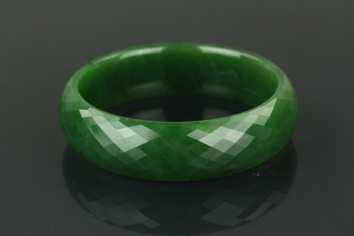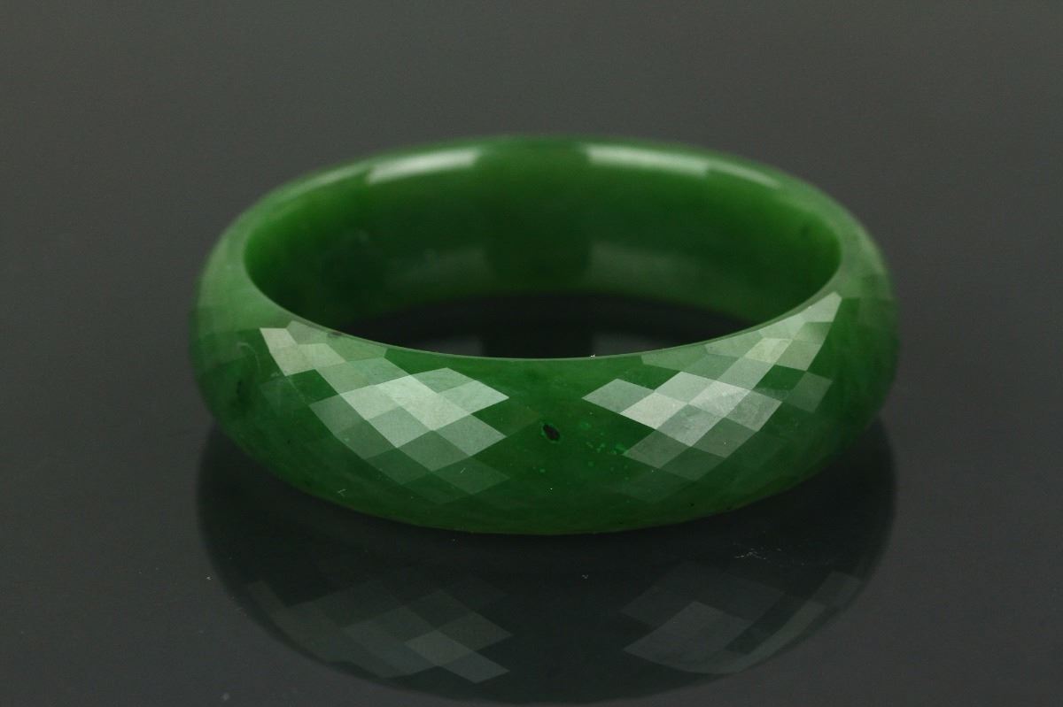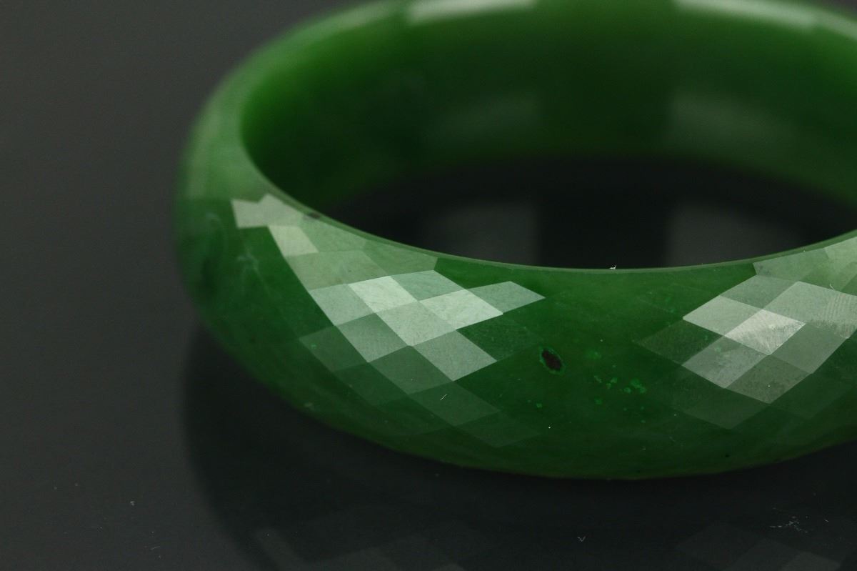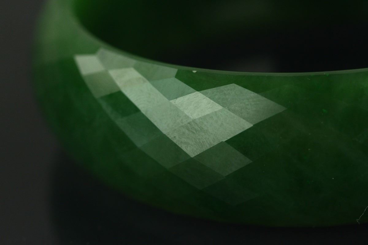 Canadian British Columbia Grade A nephrite jade bangle; the exterior with faceted cut; of emerald green tone; Inner D: 6.1 cm, Outer D: 6.7 cm, 64 grams