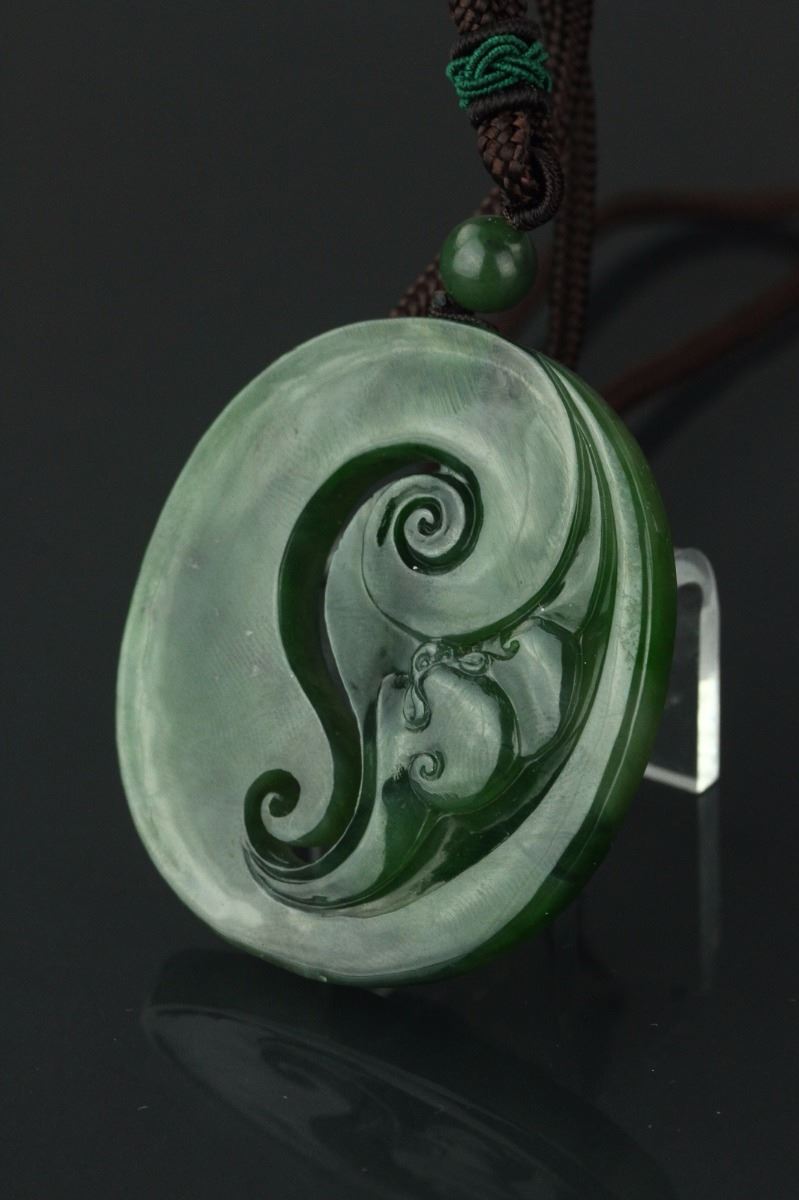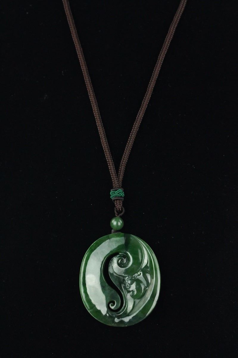Canadian British Columbia Grade A nephrite pendant necklace; of pebble-formed body with bats and spiral in low relief; suspending on brown string; H: 5.3 cm, W: 4.6 cm, 37 grams