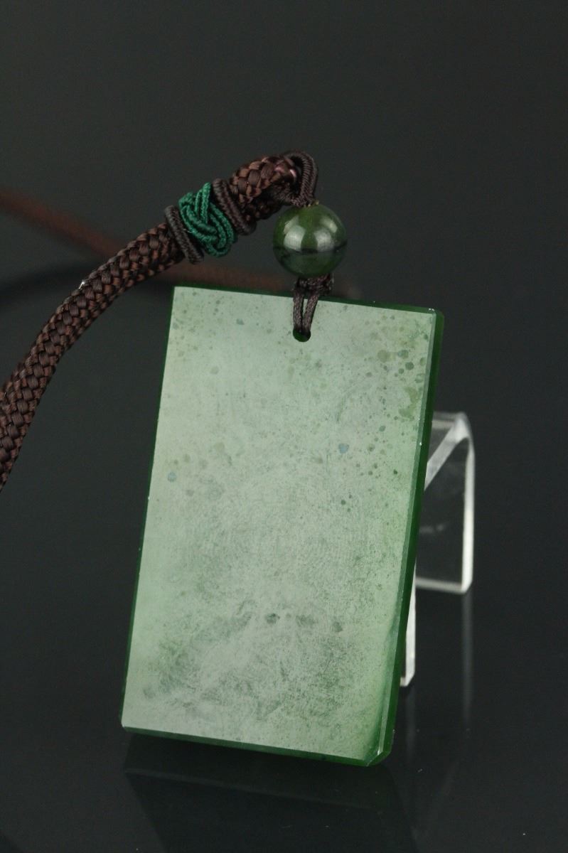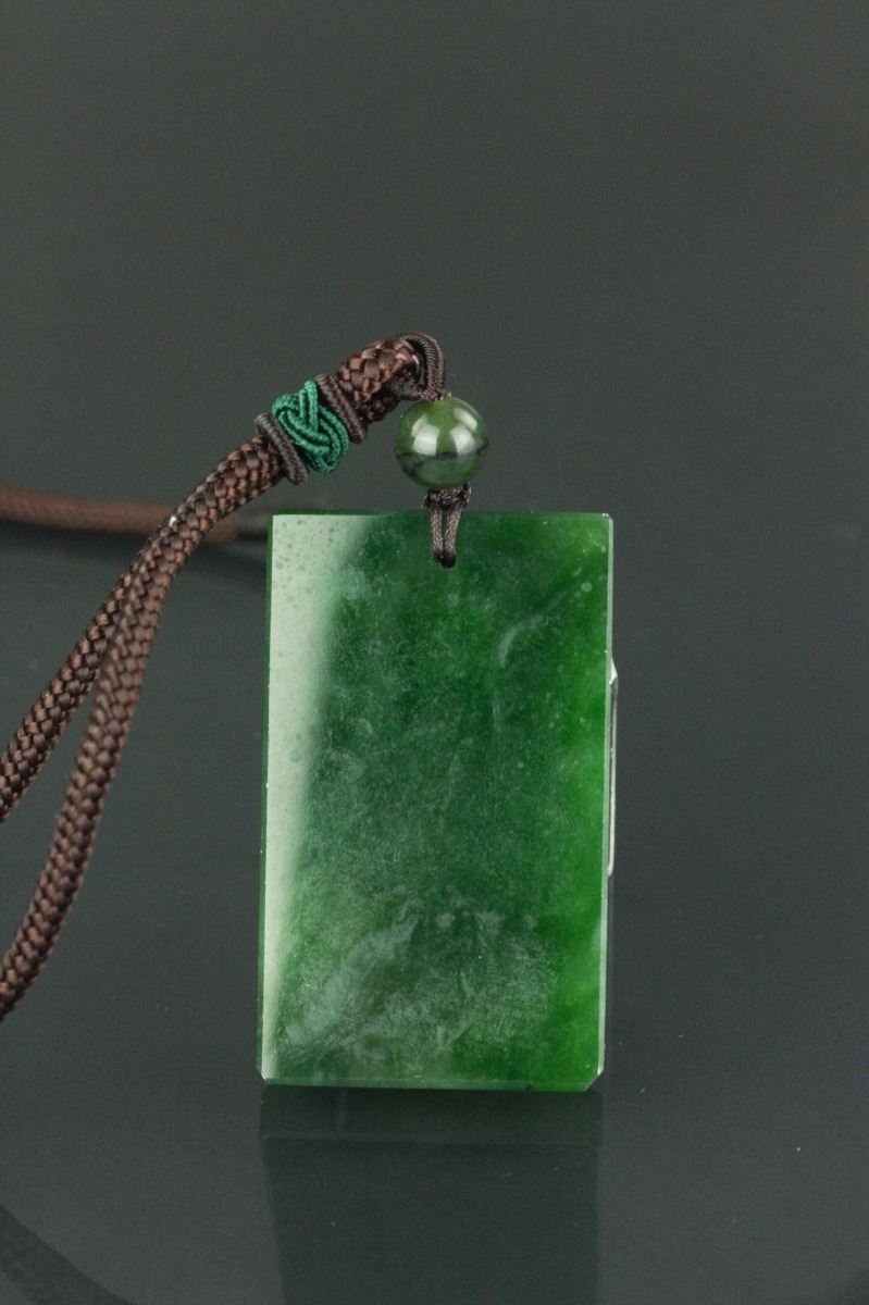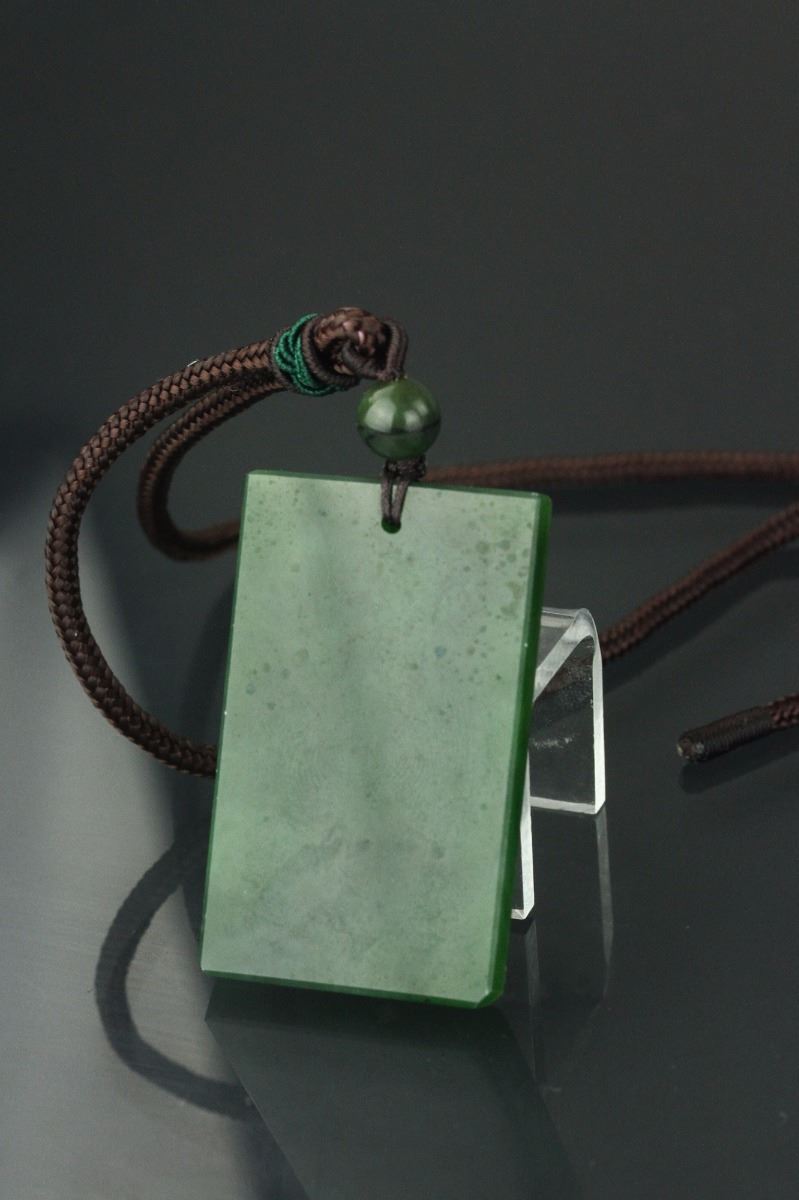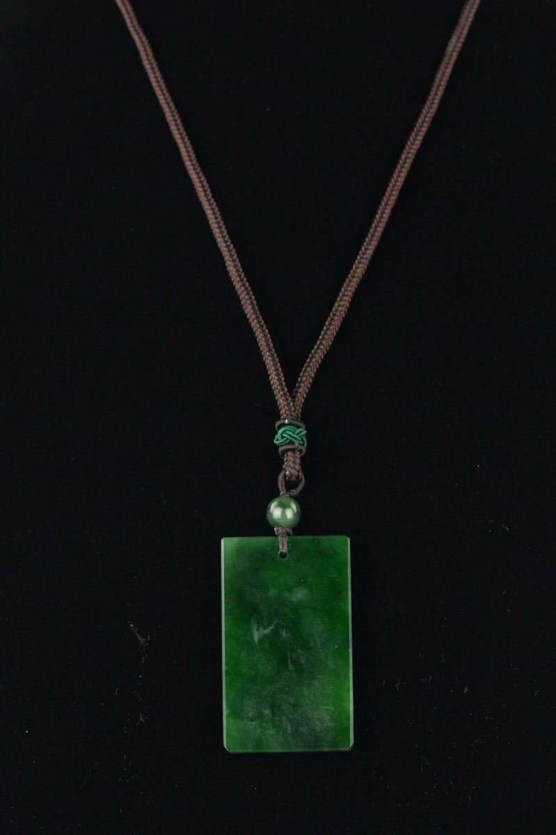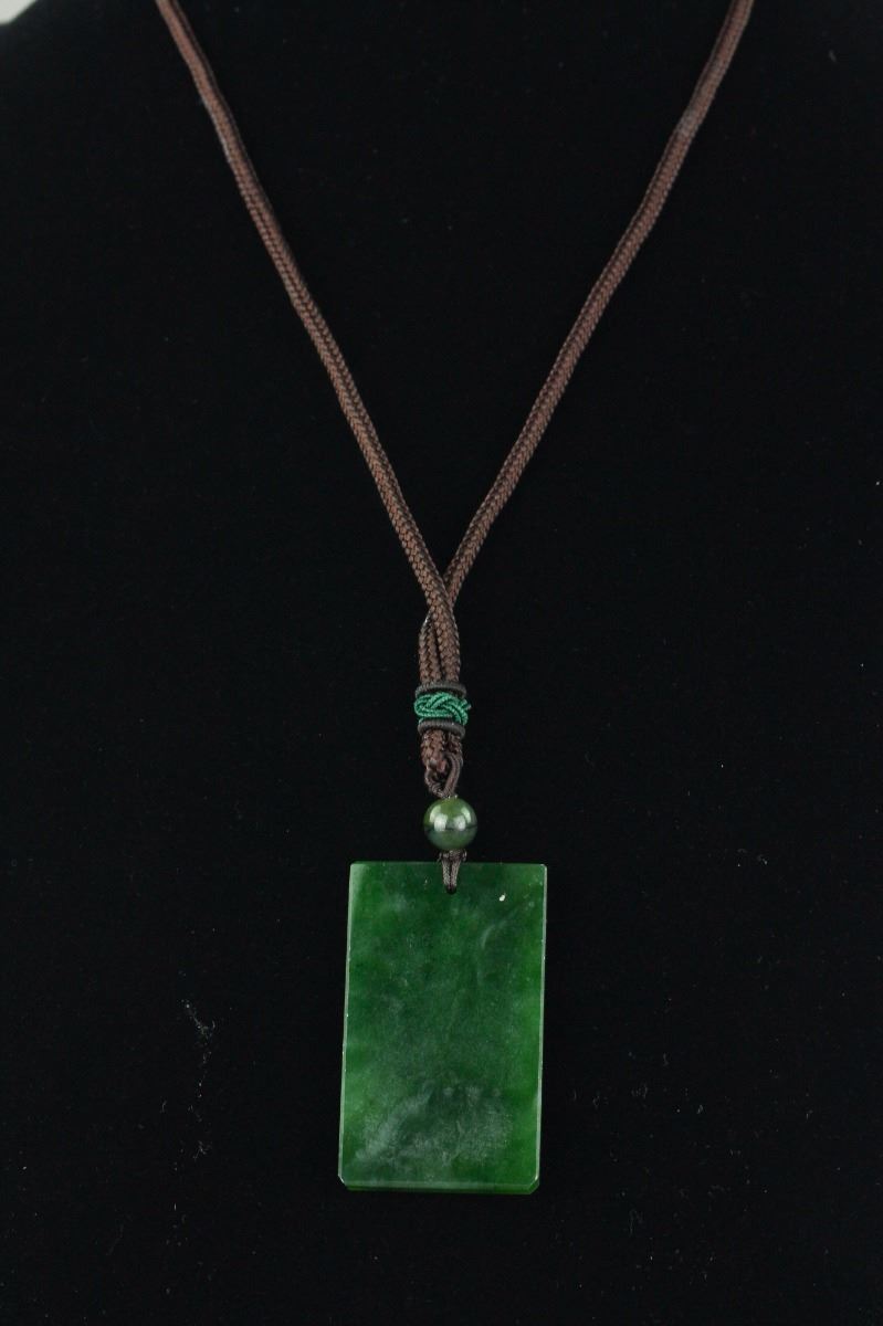 Canadian British Columbia Grade A nephrite pendant necklace; comprised of a rectangular green jade plaque; suspending on brown string; H: 4.9 cm, W: 2.9 cm, 28 grams