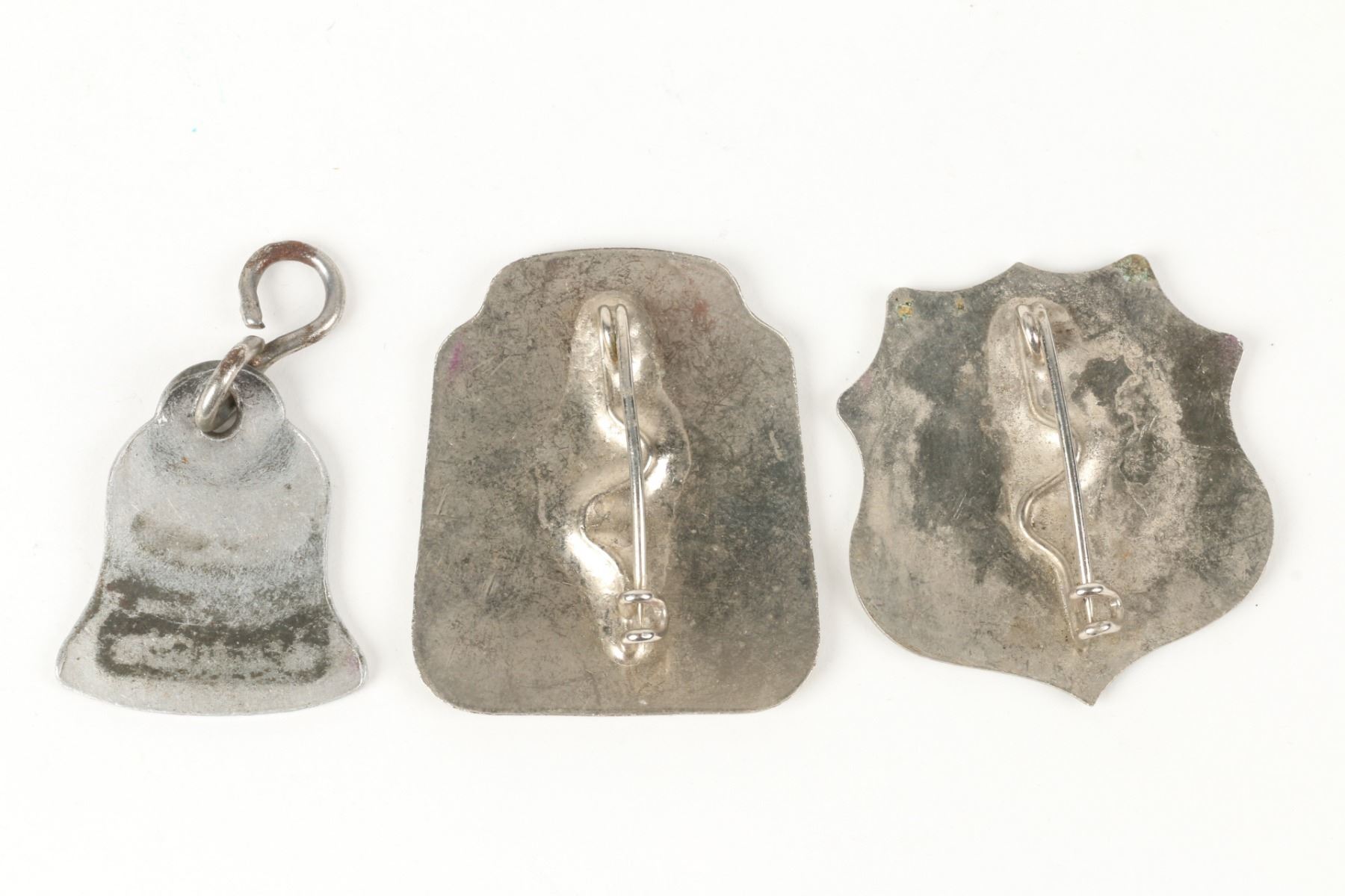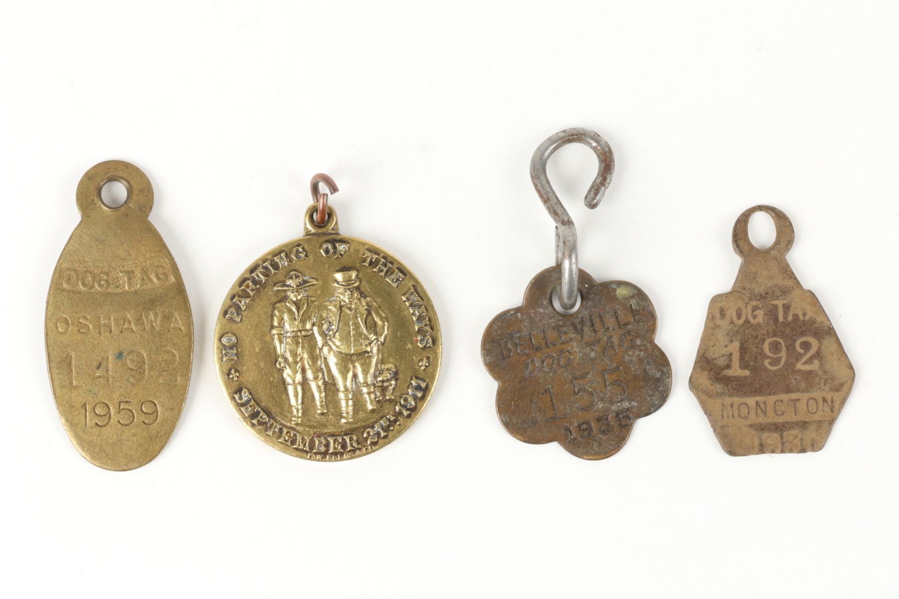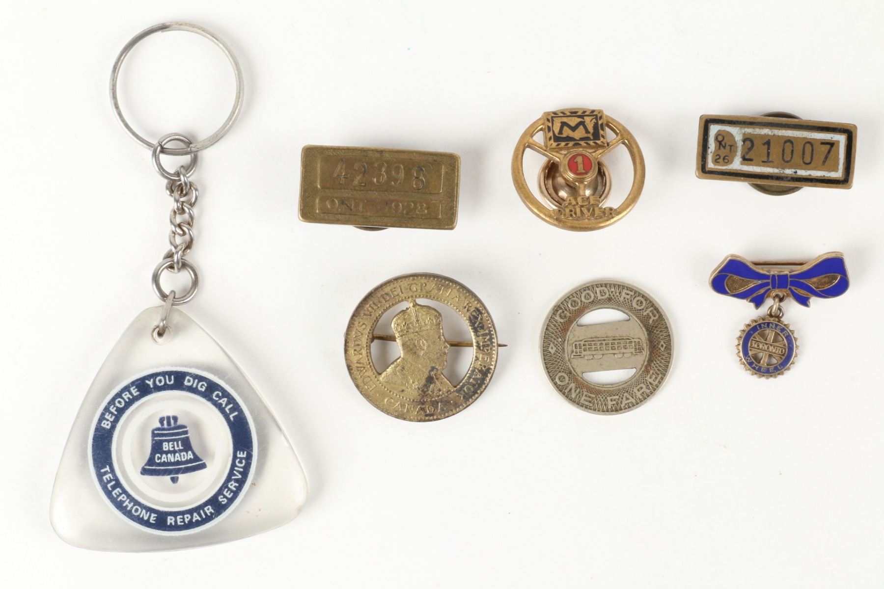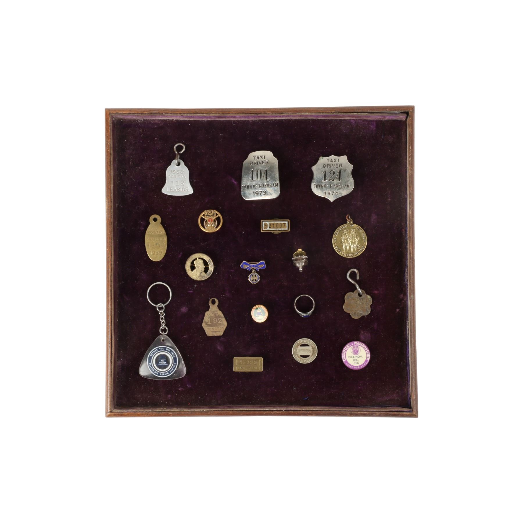 Eighteen (18) items. Dating from 1912 - 1974. Includes 3 chauffeur badges, 4 dog tags, 2 taxi driver badges, 3 tokens, 3 Bell Canada items, safe driver awards. .5" to 1.5". Untouched original condition. $200-300.