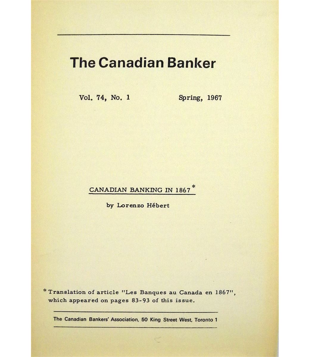 Hébert, Lorenzo. CANADIAN BANKING IN 1867. The Canadian Banker, Vol. 74, No. 1 (Spring 1967). Toronto: Canadian Bankers’ Association. 8vo, original printed card covers. 12 pages. Fine. Translated from the French original.