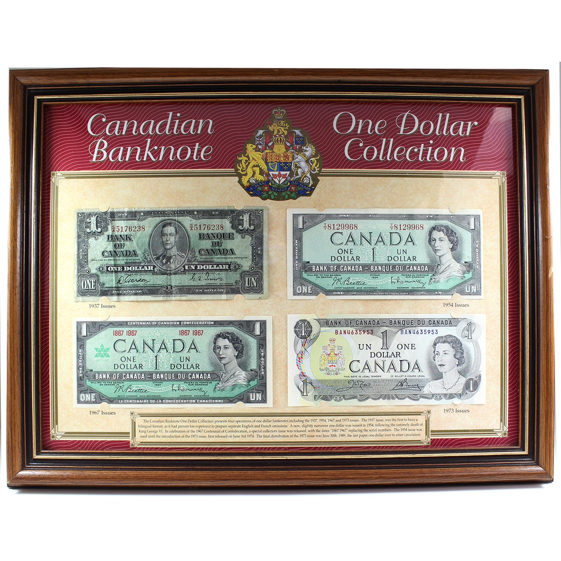 This set features Canadian $1 banknotes of 1937, 1954, 1967, & 1973. The frame also contains a paragraph with an interesting fact about each bill.