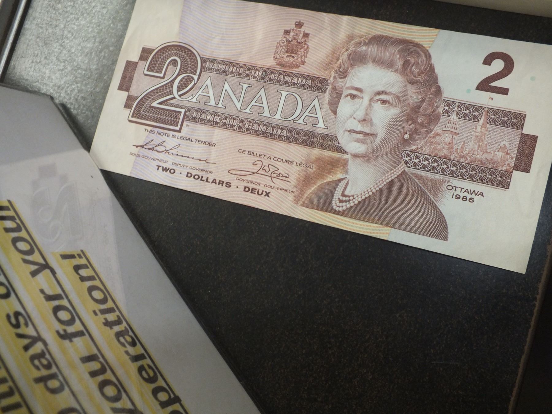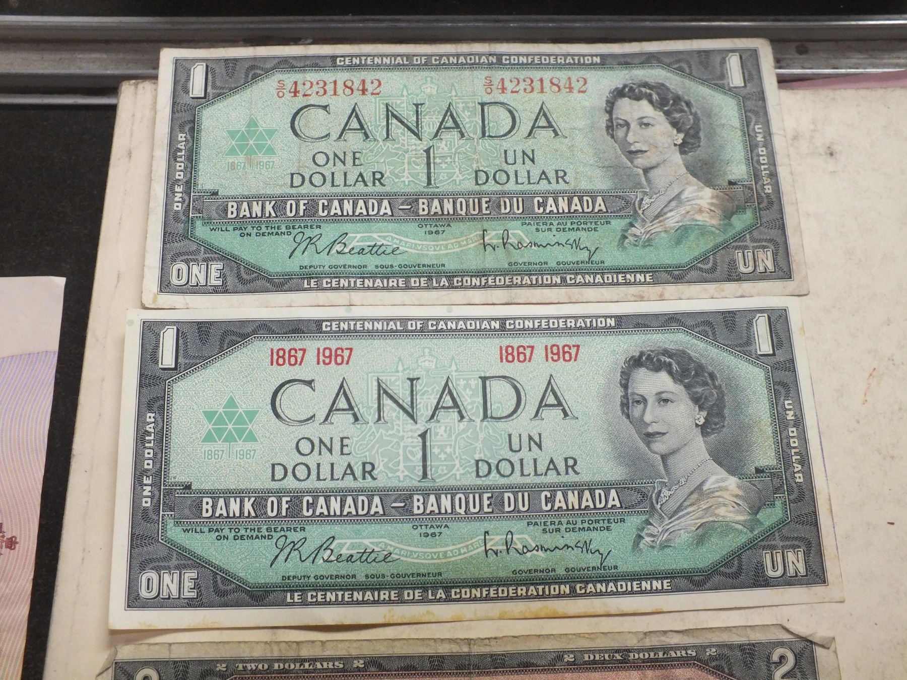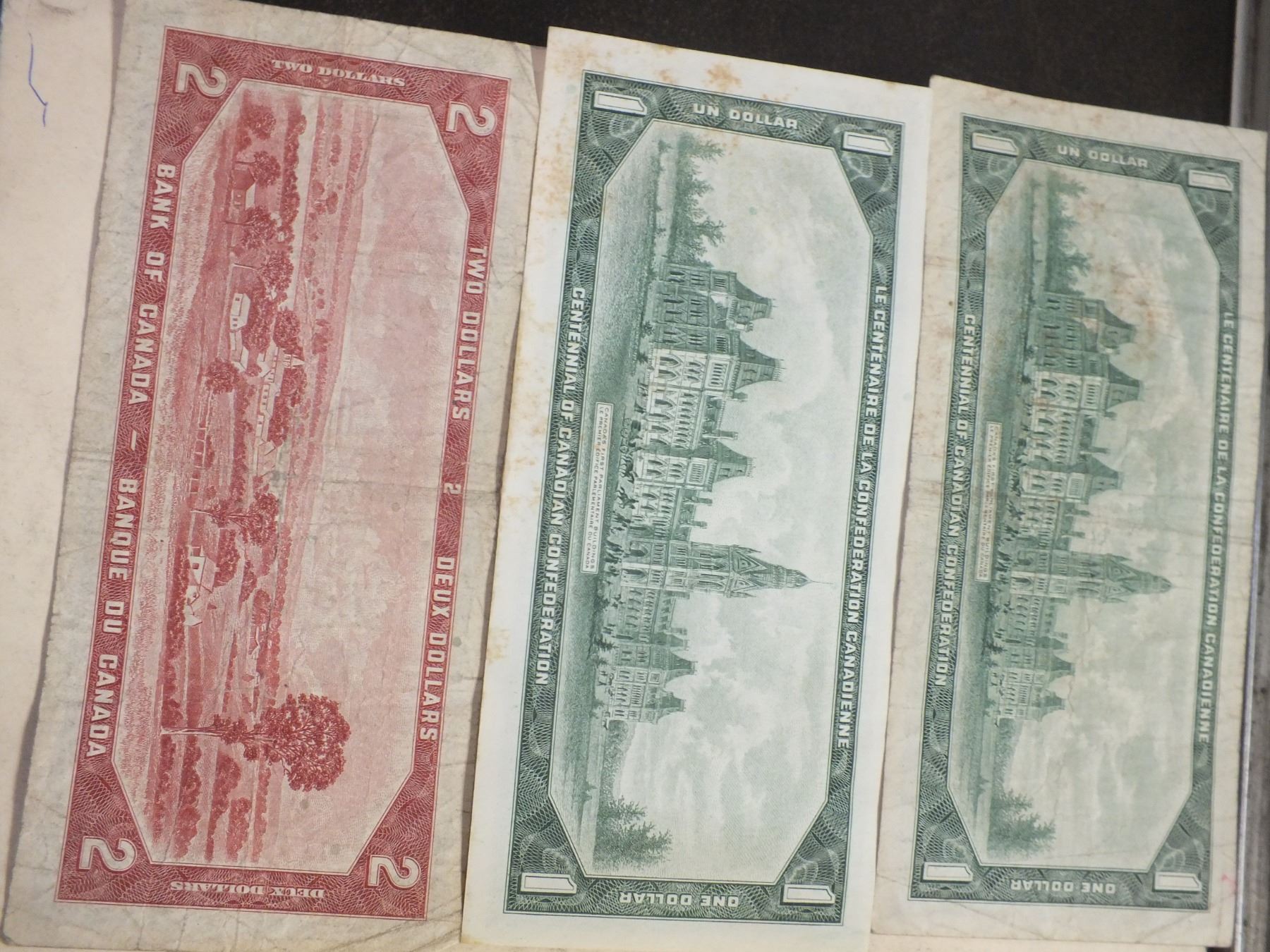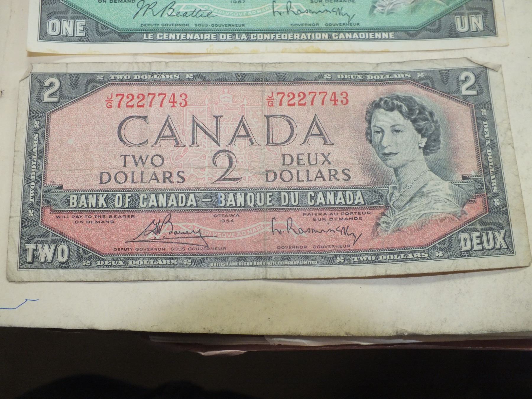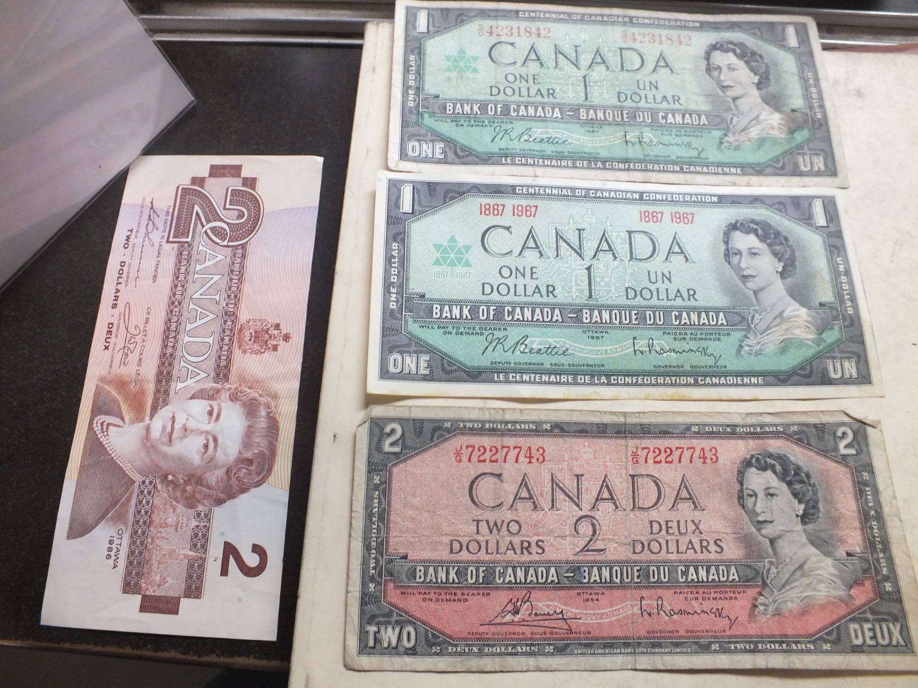 you get 1967 1 dollar bills x2, 1954 Canadian 2 dollar bill, and 1 1986 Canadian 2 dollar bill...used