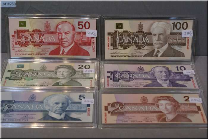 Canadian Bird Specimen note set 1986-1991 including $2, $5, $10, $20, $50 and $100 bills