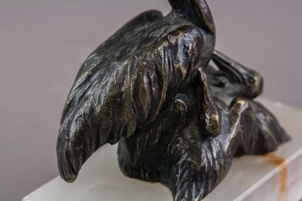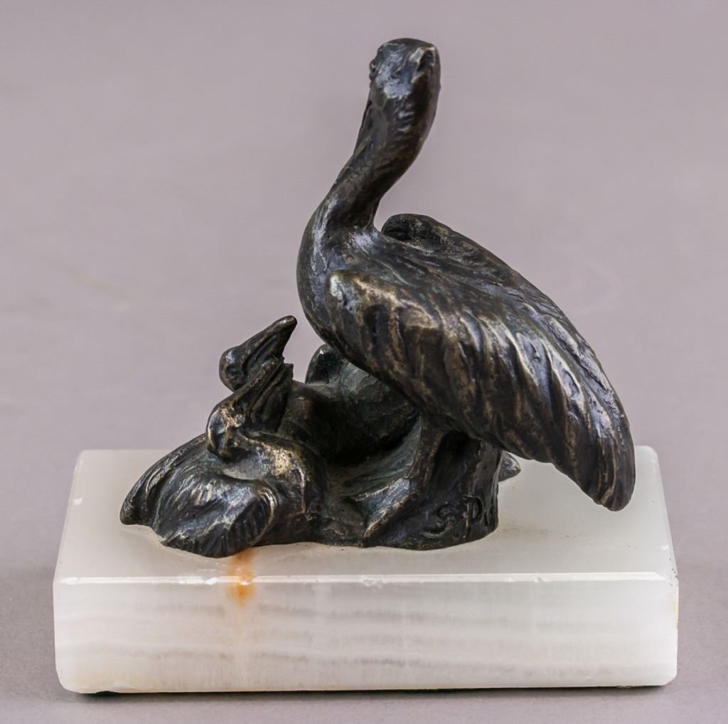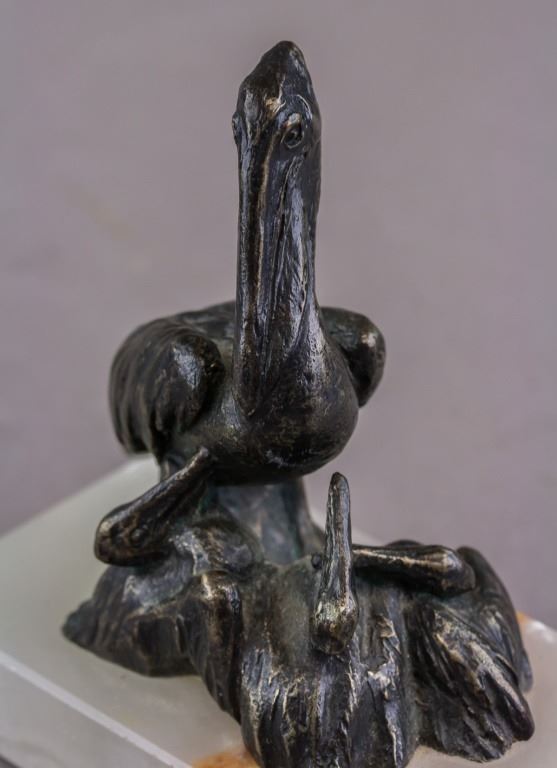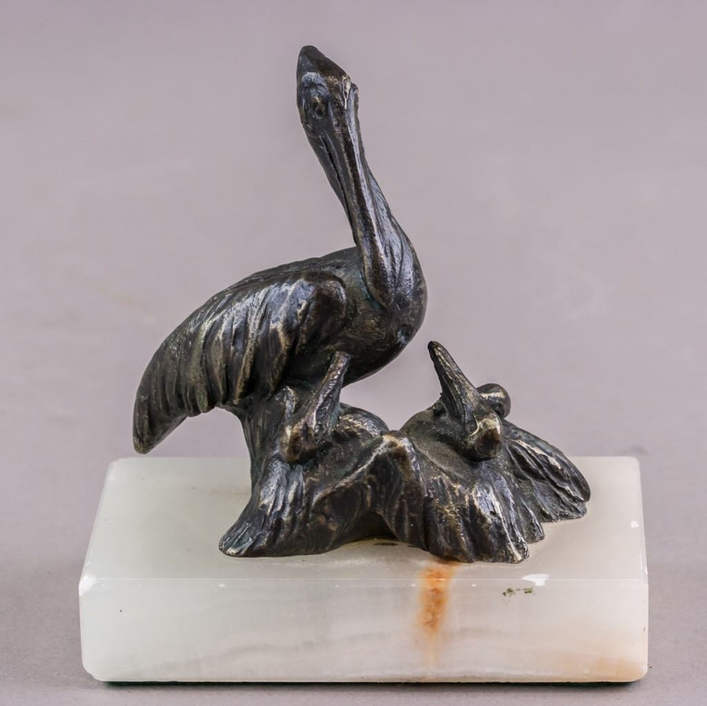 Canadian bronze pelican. Of dark brown town. Featuring an adult pelican with two chicks. On white stone base. 12 x 11 cm. 766 grams.