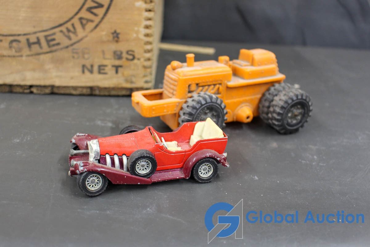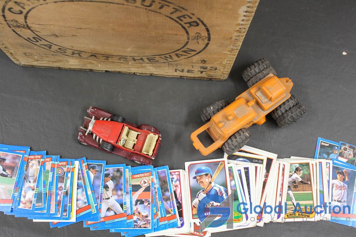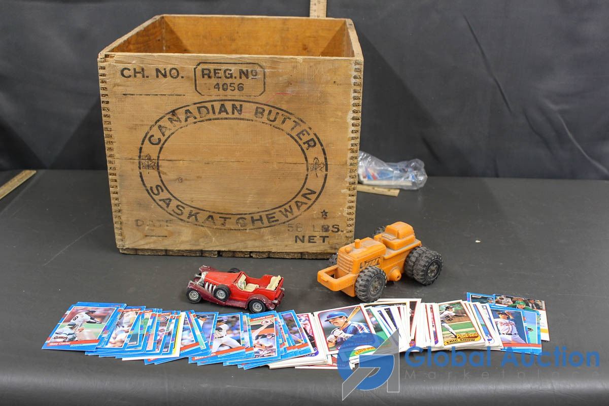 Canadian Butter Wooden Box, 2 Toy Cars & Baseball Cards