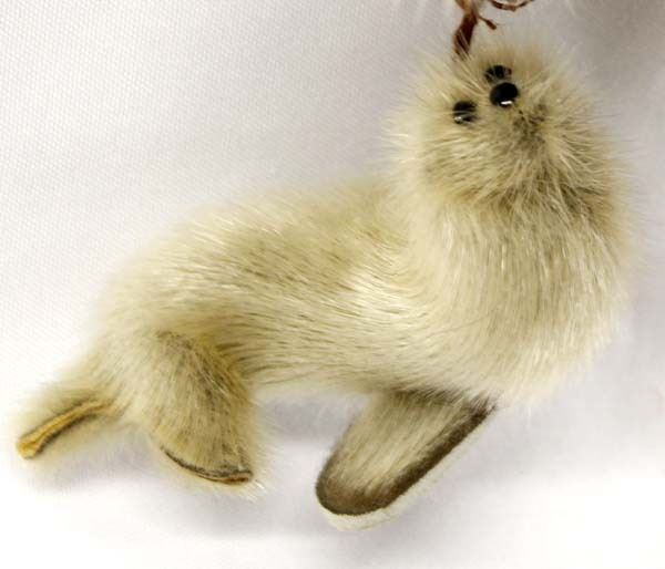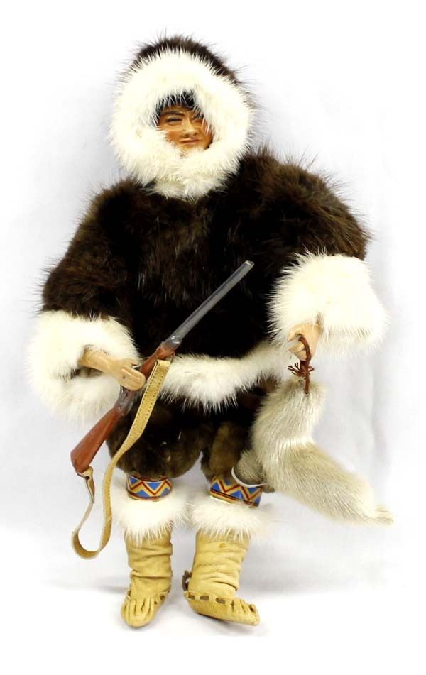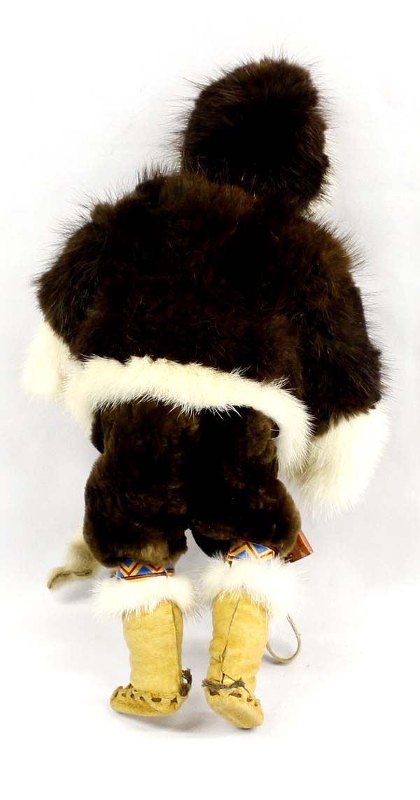 Canadian Christo-Enr.Co. Inuit Doll, wearing an authentic fur parka and pants, leather fur toped Muk Luks, carrying a rifle in one hand, and a seal in the other (authentic fur on seal), measures 7'' x 13''