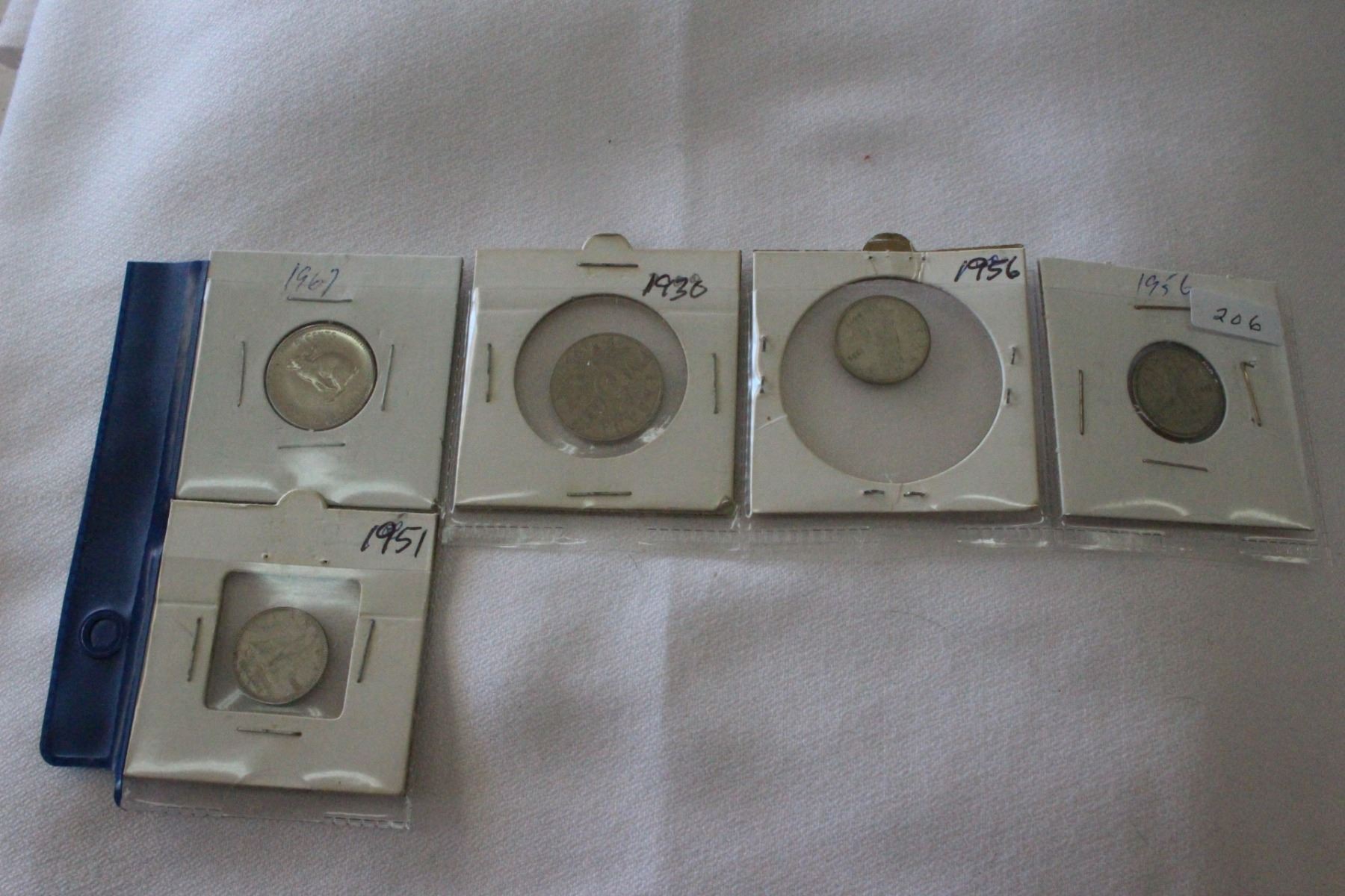 (1) 1967 Five Cent; (1) 1930 Five Cent; (2) 1956 Ten Cents; (1) 1951 Ten Cent