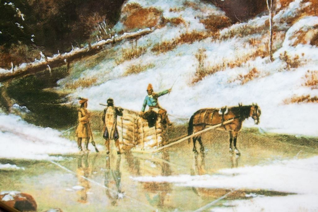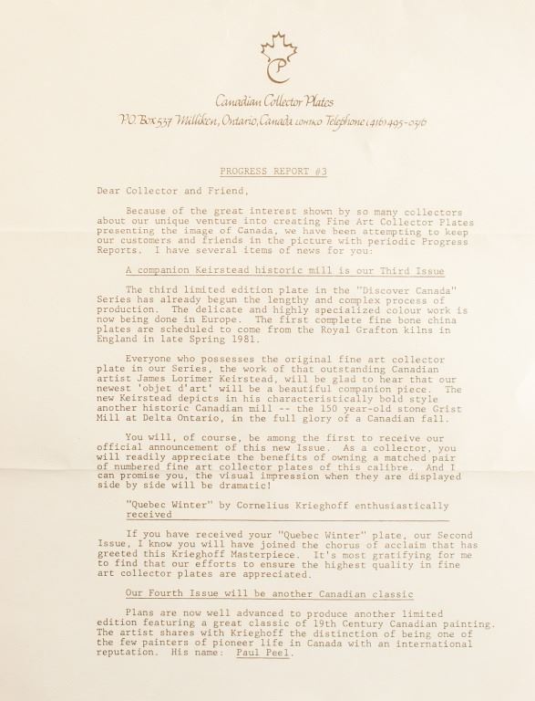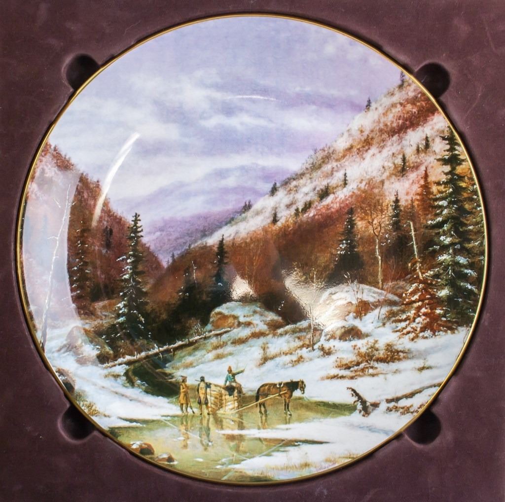 Canadian porcelain plate. Collector item. Snowy mountain scene depicted on plate. "Canadian Collector Plates "Discover Canada" Sries / Second Edition "Quebec Winter" vy Krieghoff" printed on back of box. Accompanied with two pieces of documentation. 31 x 31 cm. 1,148 grams.