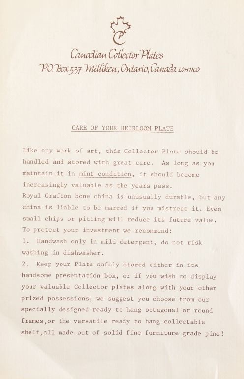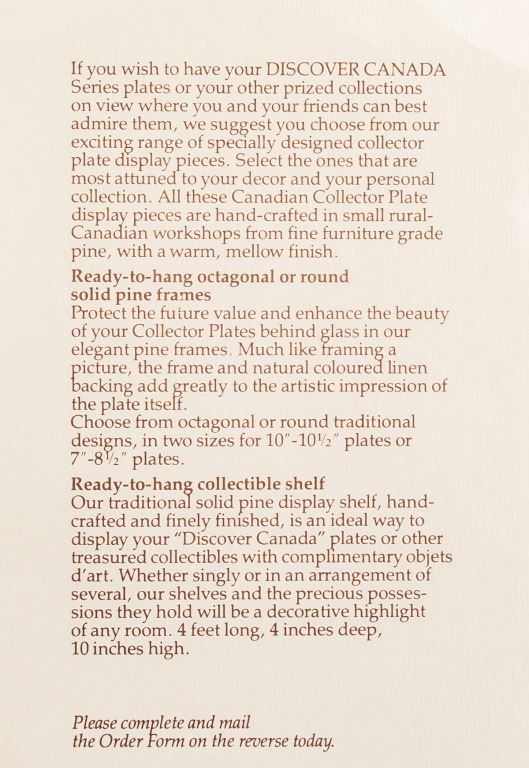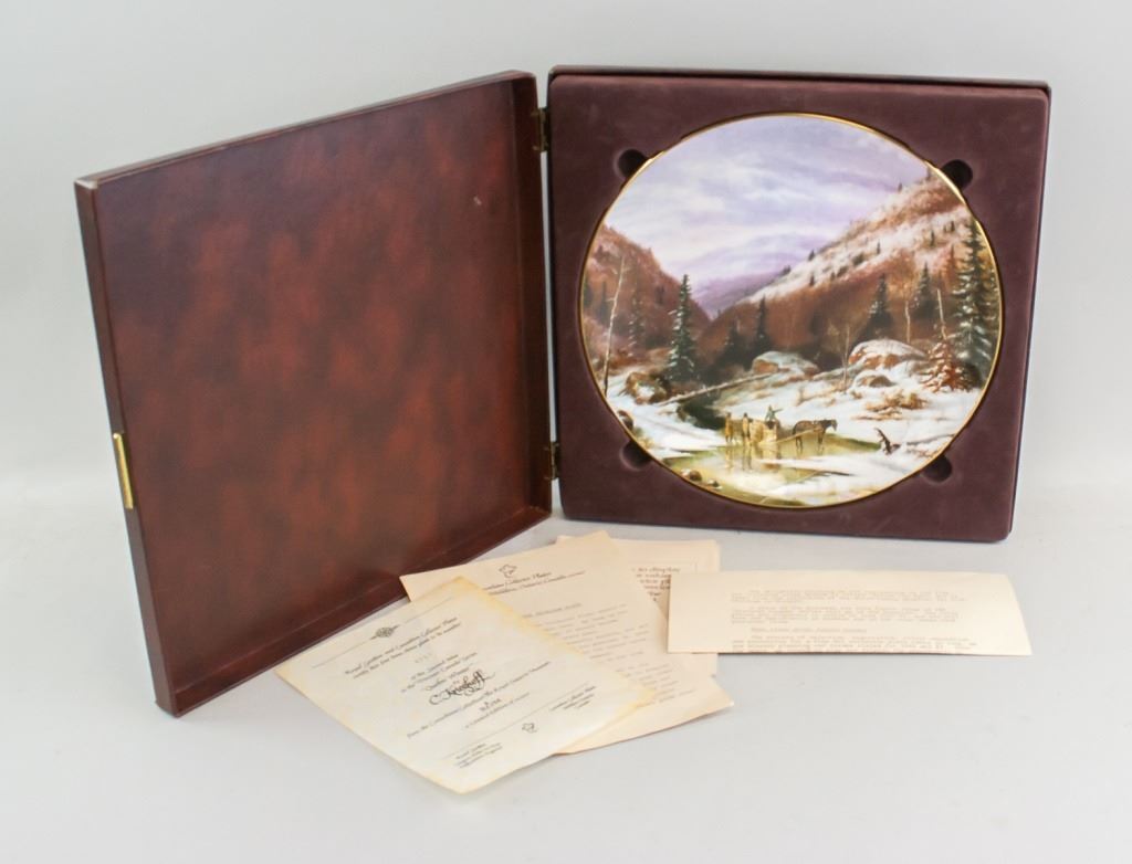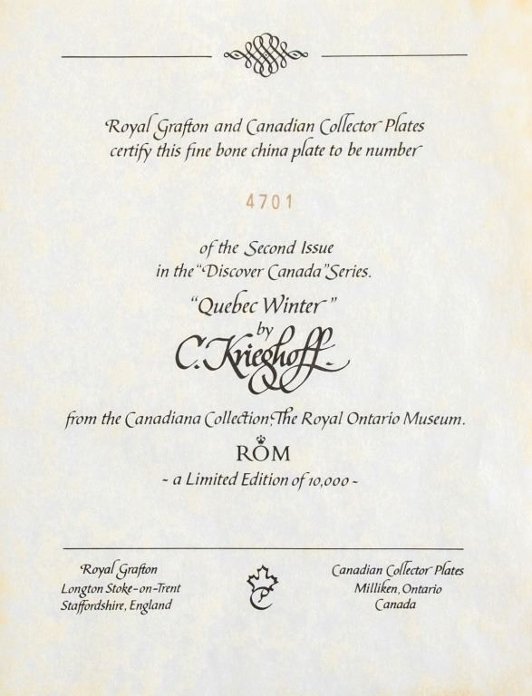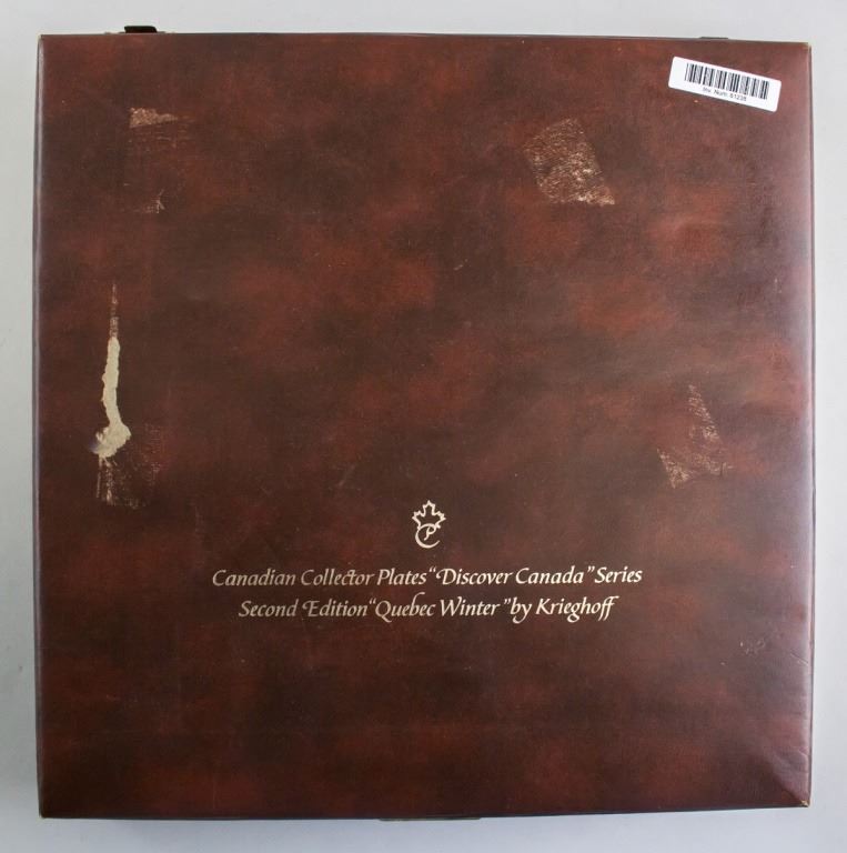 Canadian porcelain plate. Collector item. Snowy mountain scene depicted on plate. "Canadian Collector Plates "Discover Canada" Sries / Second Edition "Quebec Winter" vy Krieghoff" printed on back of box. Accompanied with two pieces of documentation. 31 x 31 cm. 1,148 grams.