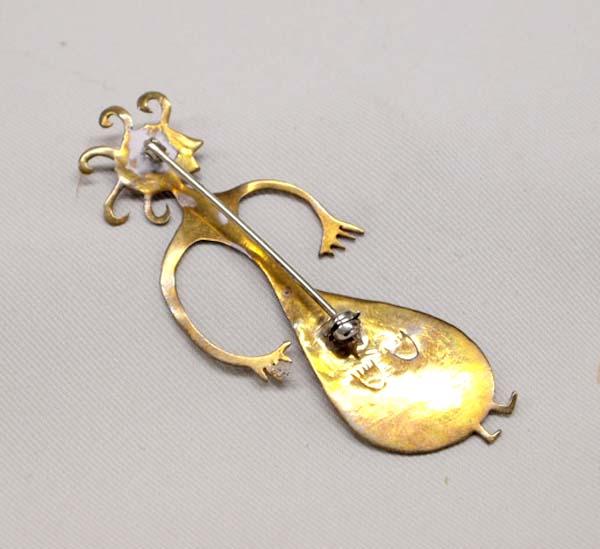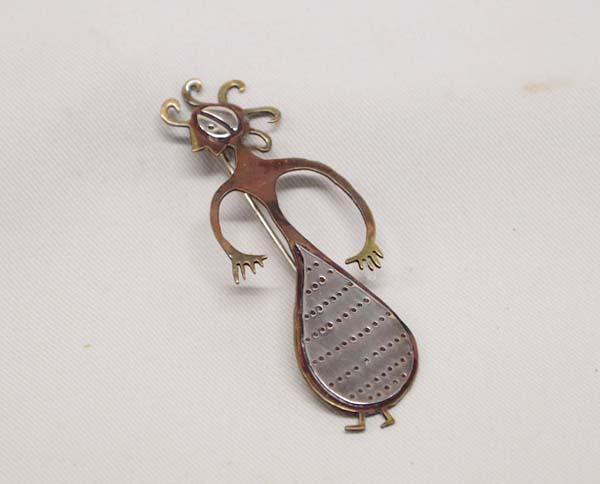 Copper Silver Goddess Pin by ''Owl Healer''. Pin measures 2.5''Lx1''W. Owl Healer is a healer who lives in Canada with her artist husband. This design is inspired by cave drawings in Crete. Information on Owl Healer is included. Copper base with silver overlay. SHI $15.